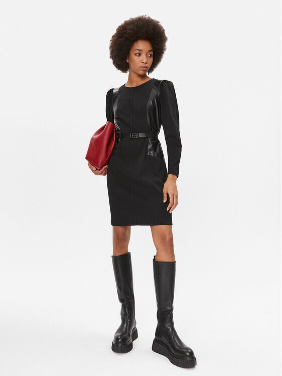 Узор: Гладкий. Застежка: на молнии. Вырез: Круглый. Рукав: длинный рукав. В комплекте: ремень из искусственной кожи. Примерка: стандартная посадка. Длина: Мини. Состав: 66 % полиэстер, 30 % переработанный полиэстер, 4 % эластан.