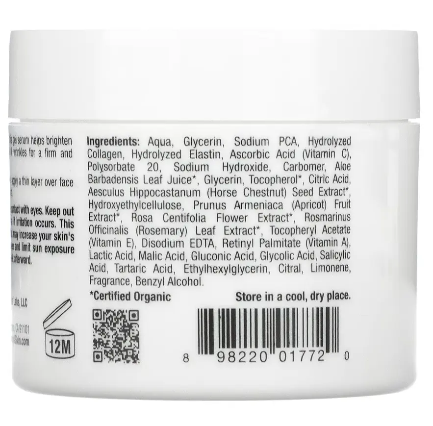 Вода, глицерин, натрий РСА, гидролизованный коллаген, гидролизованный эластин, аскорбиновая кислота (витамин С), полисорбат 20, гидроксид натрия, карбомер, сок листьев алоэ вера*, глицерин, токоферол*, лимонная кислота, экстракт семян конского каштана. *, гидроксиэтилцеллюлоза, экстракт плодов Prunus Armeniaca (абрикоса)*, экстракт цветков розы центифолии*, экстракт листьев розмарина лекарственного (розмарина)*, токоферилацетат (витамин Е), динатрий ЭДТА, ретинилпальмитат (витамин А), молочная кислота, яблочная кислота , глюконовая кислота, гликолевая кислота, салициловая кислота, винная кислота, этилгексилглицерин, цитраль, лимонен, отдушка, бензиловый спирт.