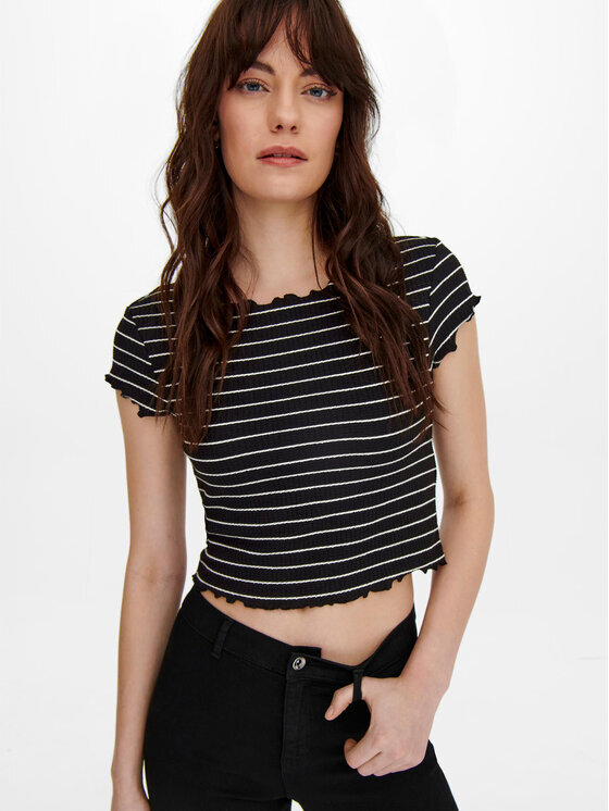 Узор: Полосы Вырез: Круглый. Примерка: стандартная посадка. Длина: короткая. Состав: 50% хлопок, 45% полиэстер, 5% эластан.