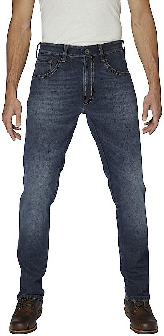 Стойкие к истиранию однослойные мотоциклетные джинсы в пяти карманах с застежкой-молнией.