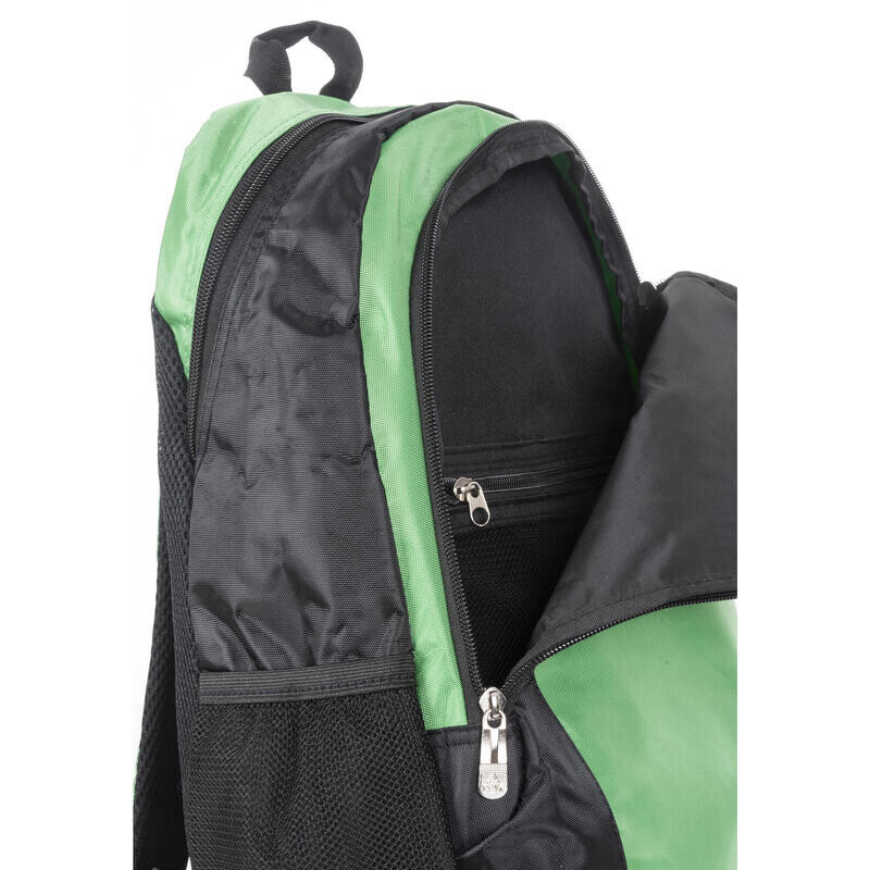 Переднее внешнее отделение рюкзака, в котором находится еще одно маленькое запирающееся сетчатое отделение, также может закрываться на двойную металлическую молнию. Снаружи есть два сетчатых боковых кармана, например для бутылок.