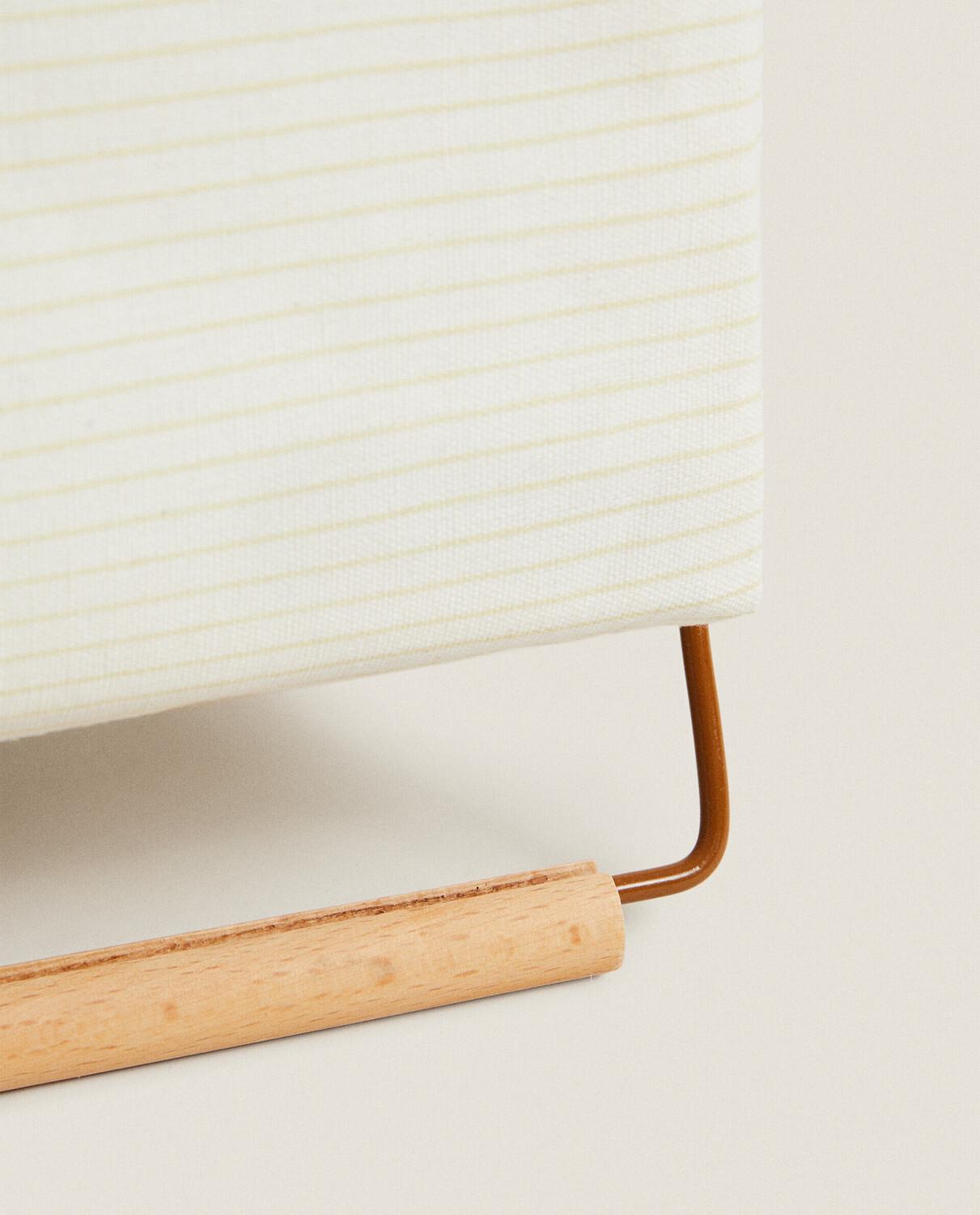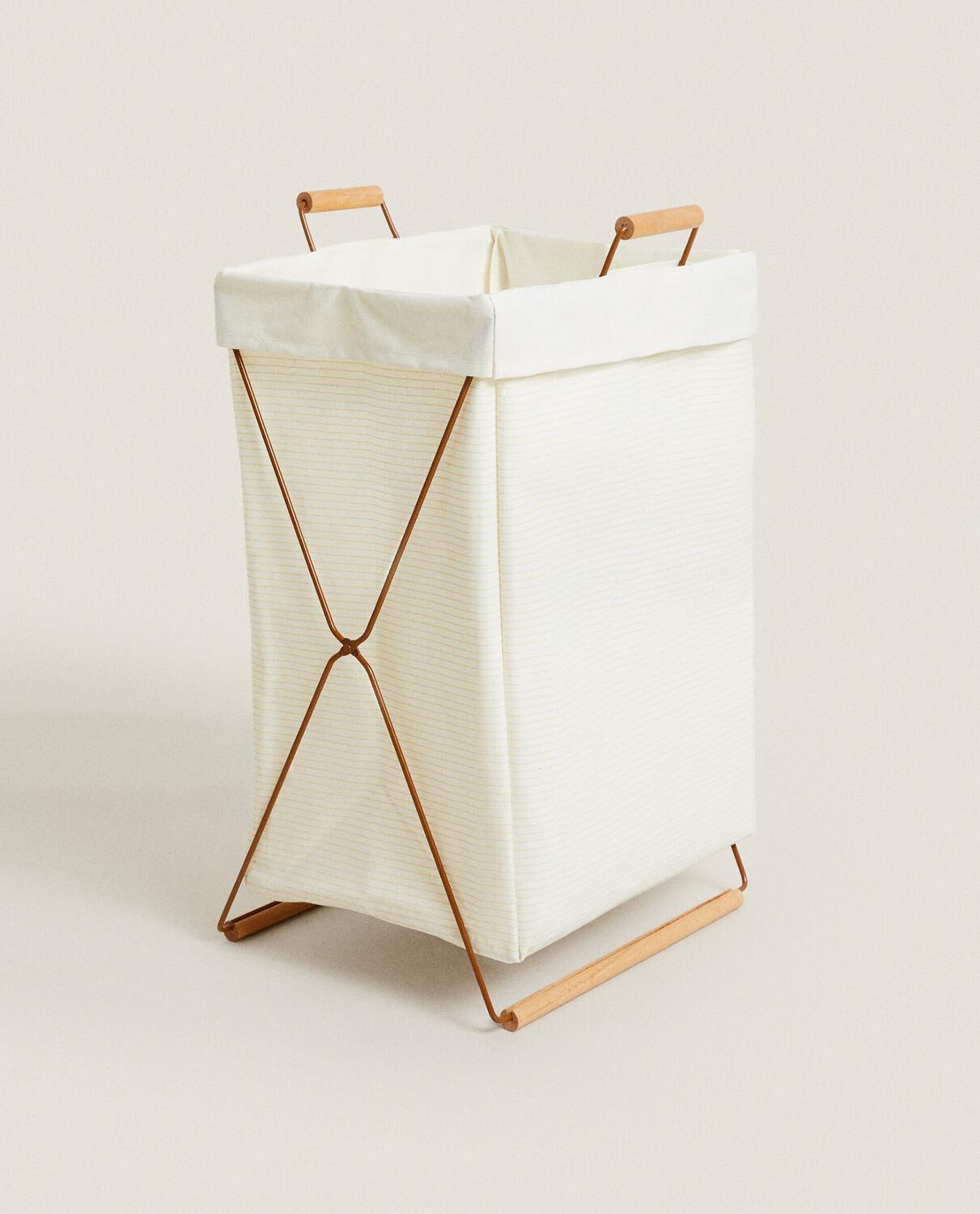 Складная корзина для белья с металлической конструкцией и деревянными ручками.Хлопчатобумажную подкладку можно стирать.