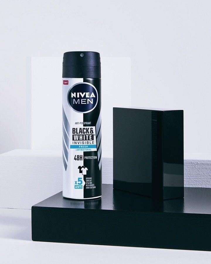 Nivea Men Black&White Invisible Fresh — антиперспирант, разработанный в сотрудничестве с экспертами по текстилю, чтобы обеспечить вам сильную и надежную защиту от пота без риска испачкать одежду. Спрей не оставляет белых пятен на черной одежде или желтизны на белой одежде. Уникальная формула защищает от чрезмерного потоотделения на 48 часов и помогает сохранить первоначальный цвет одежды.