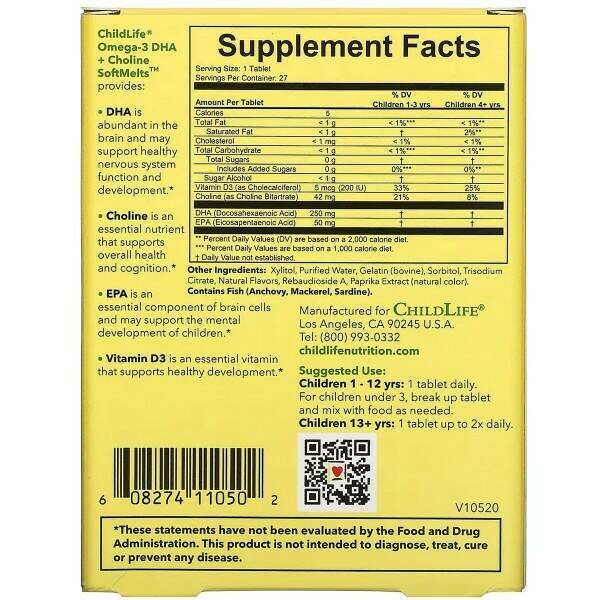 ChildLife Omega-3 DHA + Choline SoftMelts обеспечивает наполнение организма детей важными составляющими элементами для развития мозга и, в целом, организма. Так, ДГК поддерживает здоровое функционирование и развитие нервной системы. Холин является питательным веществом для поддержания общего состояния здоровья и сознания. ЭПК является составляющим компонентом клеток головного мозга чем обеспечивает умственное развитие детей. Витамин D3 является одним из базовых материалов, стоящих на страже защиты организма.