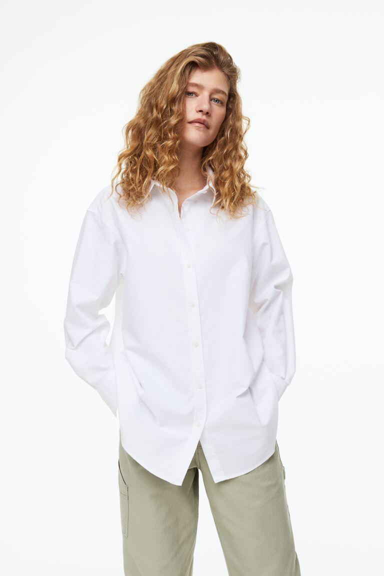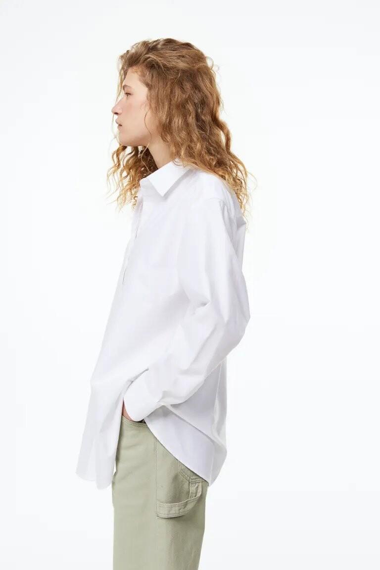 Свободная рубашка из стираного оксфордского хлопка. Воротник, пуговицы спереди и кокетка сзади. Заниженная линия плеча и длинные рукава с манжетами на пуговицах. Закругленный низ и немного удлиненная спинка.