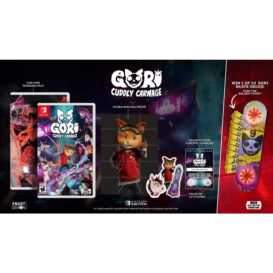 Человечество было уничтожено - и Гори вместе со своим смертоносным, но мудрым разумным ховербордом ФРАНКОМ и угрюмым искусственным спутником CH1-P должен уничтожить злую Очаровательную Армию смертельными комбо. Подпитываемая ненасытным спросом, Cool-Toys Inc. создал «Ultra Pets». Настоящие компаньоны, которые никогда не голодают, не требуют походов в туалет и невосприимчивы к разрушительному воздействию времени. Мало кто ожидал мутации, которая превратила этих идеальных питомцев в извращенные игрушки прямо из ваших кошмаров, одержимых идеей уничтожить человечество. Освойте взрывное оружие и применяйте разрушительные комбо в эпической битве, чтобы помешать Очаровательной армии завоевать галактику и спасти профессора Y, их пропавшего создателя и единственного человека, который проявил любовь Гори и его друзей. Доведите свои боевые навыки и навыки платформера до предела, пробиваясь через извилистые ландшафты, наполненные опасностями окружающей среды, острым, как бритва, взрослым юмором и душераздирающим, бьющим пульс саундтреком. Эти упрямые герои должны выследить и уничтожить генералов Очаровательной Армии и с помощью дикой команды неожиданных союзников узнать правду о Cool Toyz Inc. слэш-приключение. Приготовьтесь развязать милую бойню! Физическое издание Gori: Cuddly Carnage включает в себя:. Эксклюзивная двусторонняя вставка «Гори», изображающая Гори в действии. Дизайн диска (версия для PS5) с изображением CH1-P — вашего очаровательного угрюмого AI-компаньона. Двусторонний настенный постер, полный кошачьего настроения. Три эксклюзивные роскошные вырезанные наклейки с изображением милого, но смертоносного Гори и его друга на ховерборде ФРЭНКА, оснащенного остроумной бритвой, а также обезглавленную голову единорога для пущей убедительности! Цифровой ваучер, дающий доступ к эксклюзивной загрузке сокрушающего кости и пульсирующего EP Gori: Cuddly Carnage. Шанс найти один из десяти золотых билетов. Те, кому посчастливится найти такой, получат радикальную скейт-деку, созданную по мотивам ФРЭНКА из игры!
