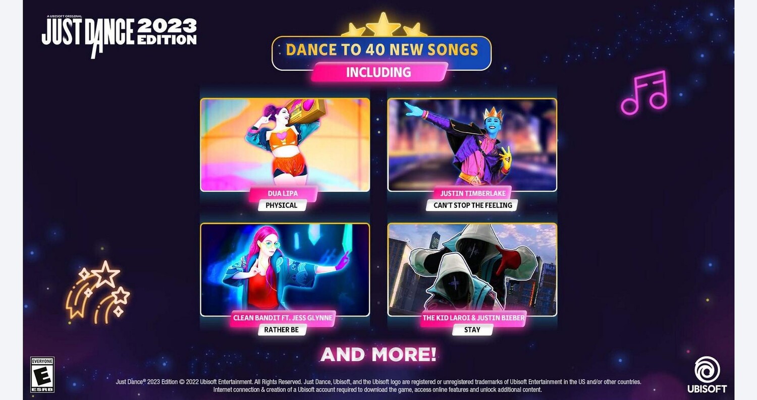 Добро пожаловать в новую эру танца с Just Dance 2023 Edition! Теперь, благодаря персонализации, захватывающим 3D-мирам, новым песням и режимам круглый год*, вы можете наслаждаться нескончаемой танцевальной вечеринкой круглый год! Just Dance 2023 — ваша танцевальная платформа по запросу! Танцуйте под хиты, возглавляющие чарты, включая:. БТС – «Динамит». Гарри Стайлс – Как это было. Леди Гага ft. Бейонсе – Телефон. Билли Айлиш – Поэтому я есть. В ролях из Энканто - Мы не говорим о Бруно. Стеклянные животные — волны тепла. Джастин Тимберлейк: НЕ МОГУ ОСТАНОВИТЬ ЧУВСТВО! ТС фут. Хэлси - Мальчик с Лув. Бруно Марс - Запертый с небес. КДА Фт. Мэдисон Бир, (G)I-DLE, Лекси Лью, Джайра Бернс и Серафина – Еще. Линкин Парк – онемевший. Дуа Липа – Физический. Ава Макс - Милая, но псих. Представьте себе драконов – радиоактивных. Апаше ft. Алина Паш – Ведьма. Доджа Кот – Женщина. И БОЛЕЕ…. *Дополнительный контент доступен по мере поступления в течение ограниченного времени в течение 12 месяцев после запуска игры; требуется загрузка. ***Just Dance+ — это потоковый сервис, в который можно играть через Just Dance 2023 Edition, который предоставляет доступ к дополнительным песням. Принять условия. Требуется подключение к учетной записи Ubisoft (13[PLUS]), постоянный доступ в Интернет и оплата комиссии. Автопродление можно активировать во время покупки. Могут действовать возрастные и территориальные ограничения.