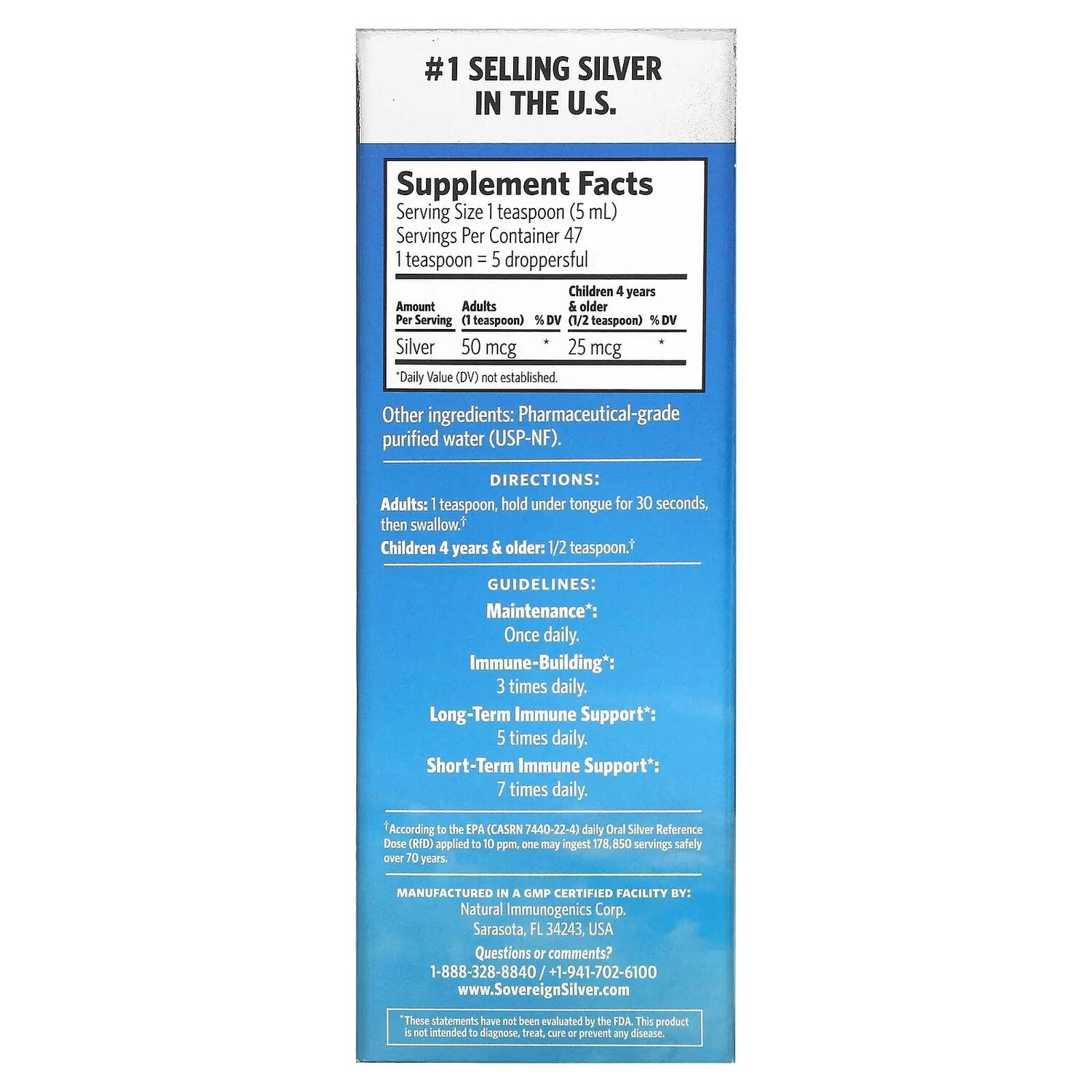 ЧистотаSovereign Sliver содержит только два ингредиента: серебро с чистотой 99,999% и очищенную воду фармацевтического качества. Продукт не содержит добавленных солей или белков, которые снижают эффективность других пищевых добавок с серебром. Кроме того, его упаковывают в стойкие к выщелачиванию флаконы из стекла, а не из пластика.