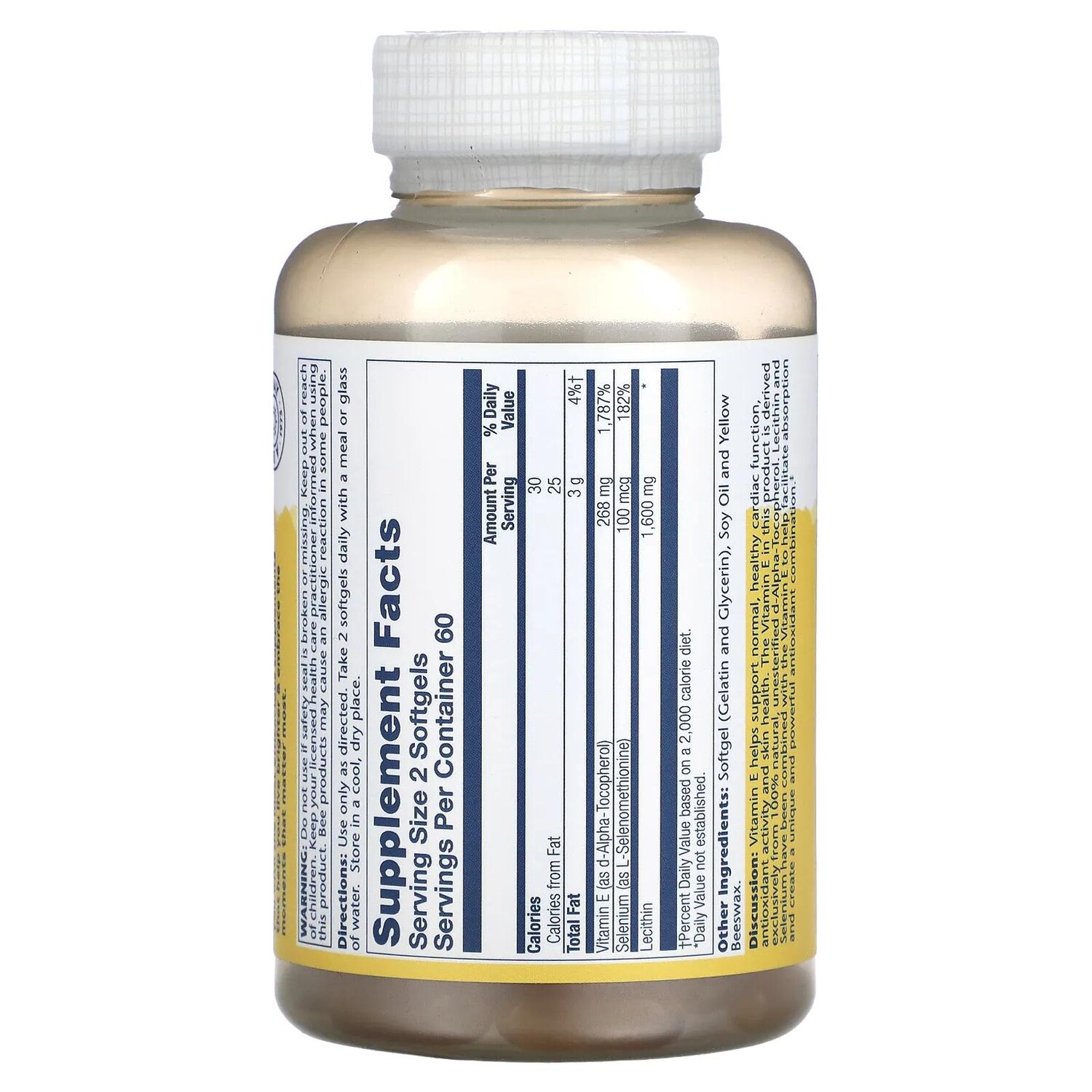 Витамин Е предназначен для обеспечения поддержки нормальной здоровой работы сердечно-сосудистой системы, антиоксидантной активности организма и здоровья кожи. Витамин Е в этом продукте получен исключительно из 100% натурального неэтерифицированного d-альфа-токоферола. Лецитин и селен объединены с витамином Е, чтобы облегчить усвоение и создать уникальную и мощную комбинацию антиоксидантов.