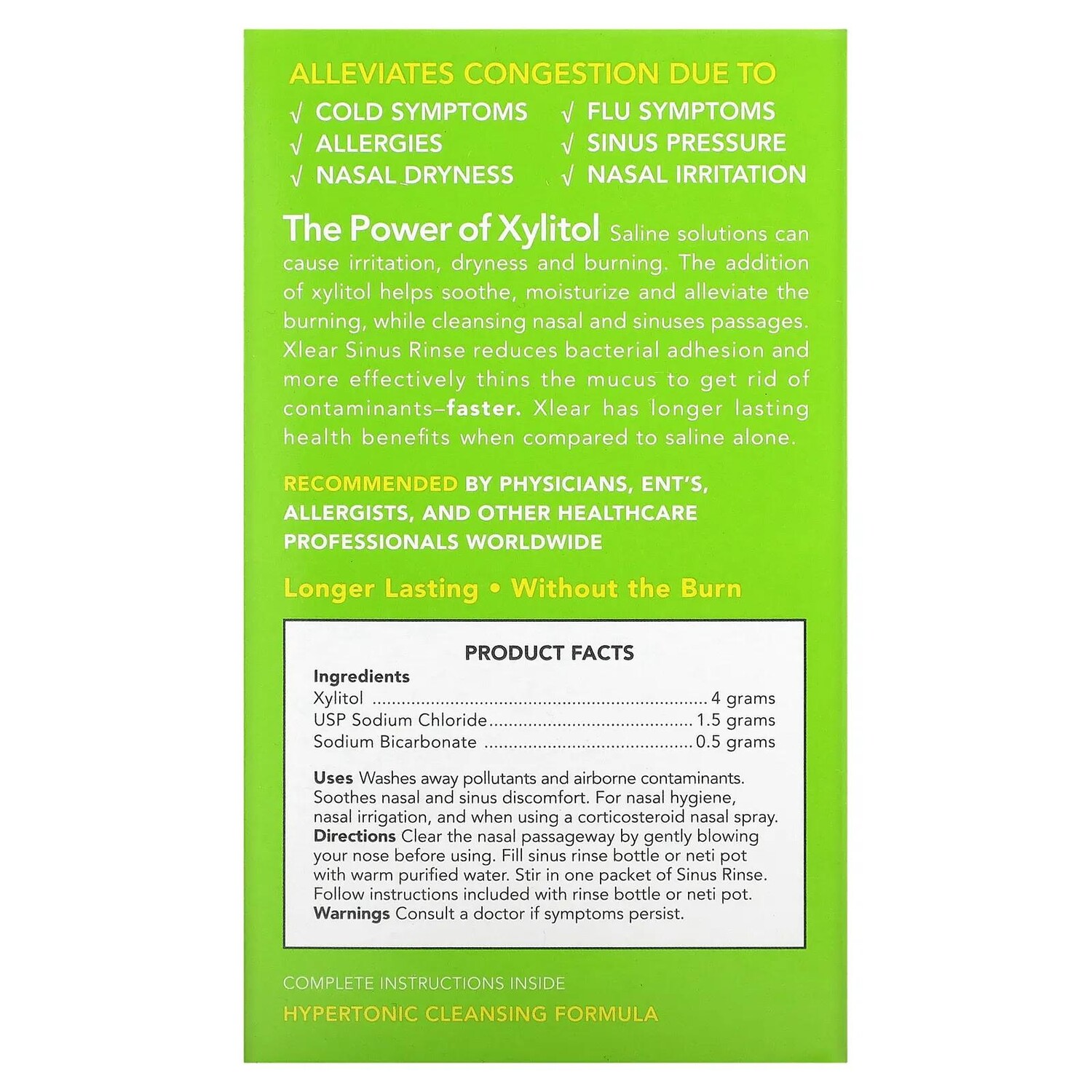 Сила ксилитола солевых растворов может вызвать раздражение, сухость и жжение. Ксилитол успокаивает, увлажняет и облегчает жжение, очищая нос и пазухи. Xlear Sinus Rinse уменьшает бактериальную адгезию и более эффективно разжижает слизь, чтобы быстрее избавиться от загрязнений. Xlear имеет более длительную пользу для здоровья по сравнению с одним физраствором.