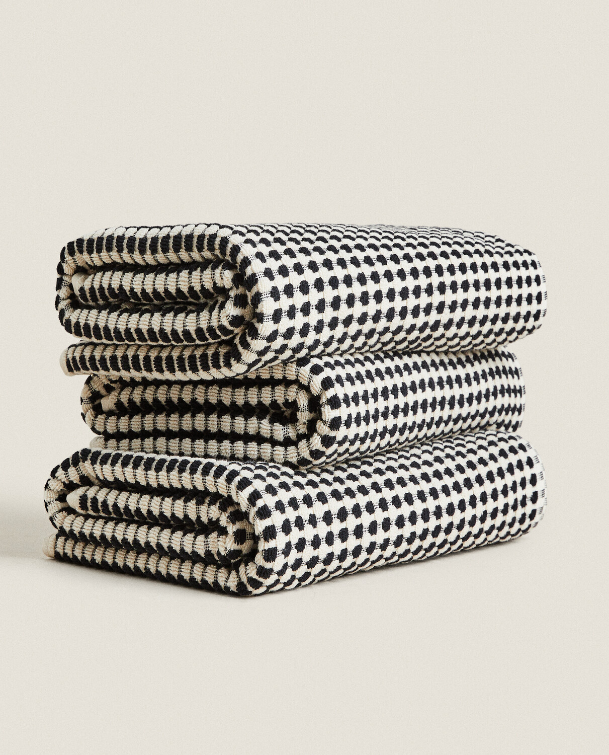 Текстурированное хлопчатобумажное полотенце с контрастным эффектом вафельного трикотажа.