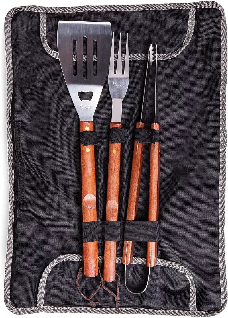 • Лопатка из нержавеющей стали с длинными деревянными ручками, встроенная открывалка для бутылок, одна вилка для барбекю. и щипцы.