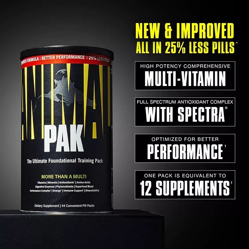 Animal Pak — это полноценное питание, содержащее более 85 хорошо усваиваемых питательных веществ, которые улучшают тренировки и повышают энергию в повседневной жизни благодаря эффективному сочетанию витаминов, минералов, аминокислот, антиоксидантов, пищеварительных ферментов, карнитина, трав и многого другого. Animal Pak — это не просто поливитамин, он восполняет пробелы в питании, гарантируя, что вы будете готовы к росту мышц и оптимальной производительности при достижении своих целей в фитнесе.