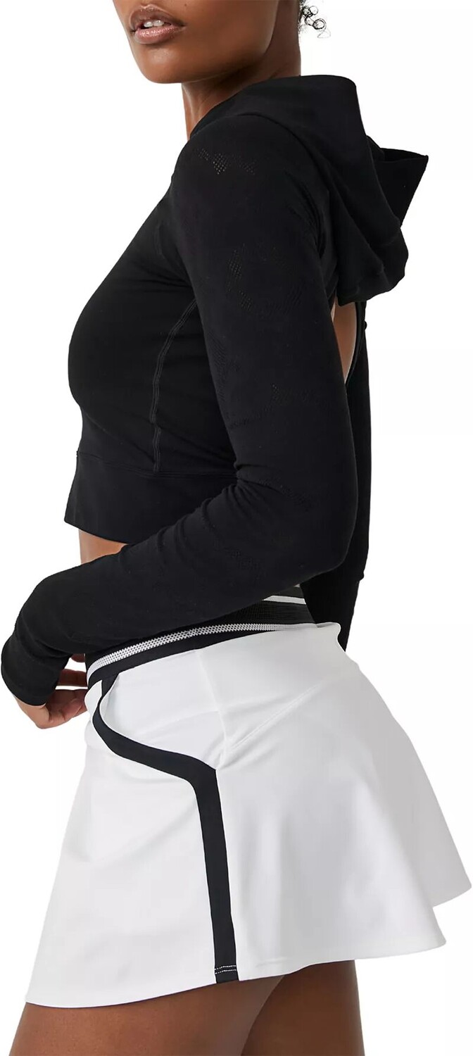 Этот топ с длинными рукавами, который можно носить как сверху, так и снизу, имеет укороченный приталенный силуэт с вырезом с капюшоном и ярким вырезом на спине.