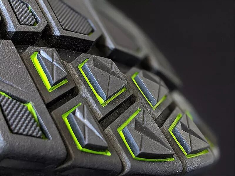• Жесткая резиновая подошва толщиной 1/4 дюйма защищает нижнюю часть обуви и имеет выступы диаметром 6 мм для агрессивный захват и гибкие канавки для маневренности.