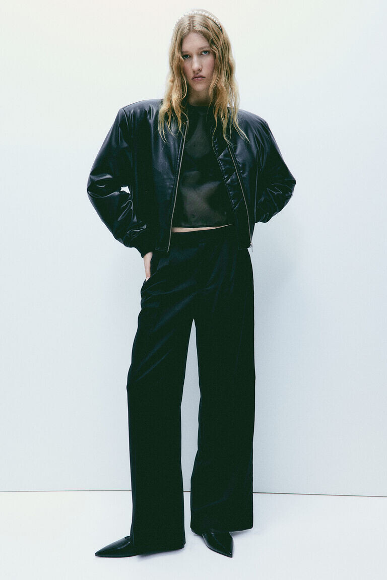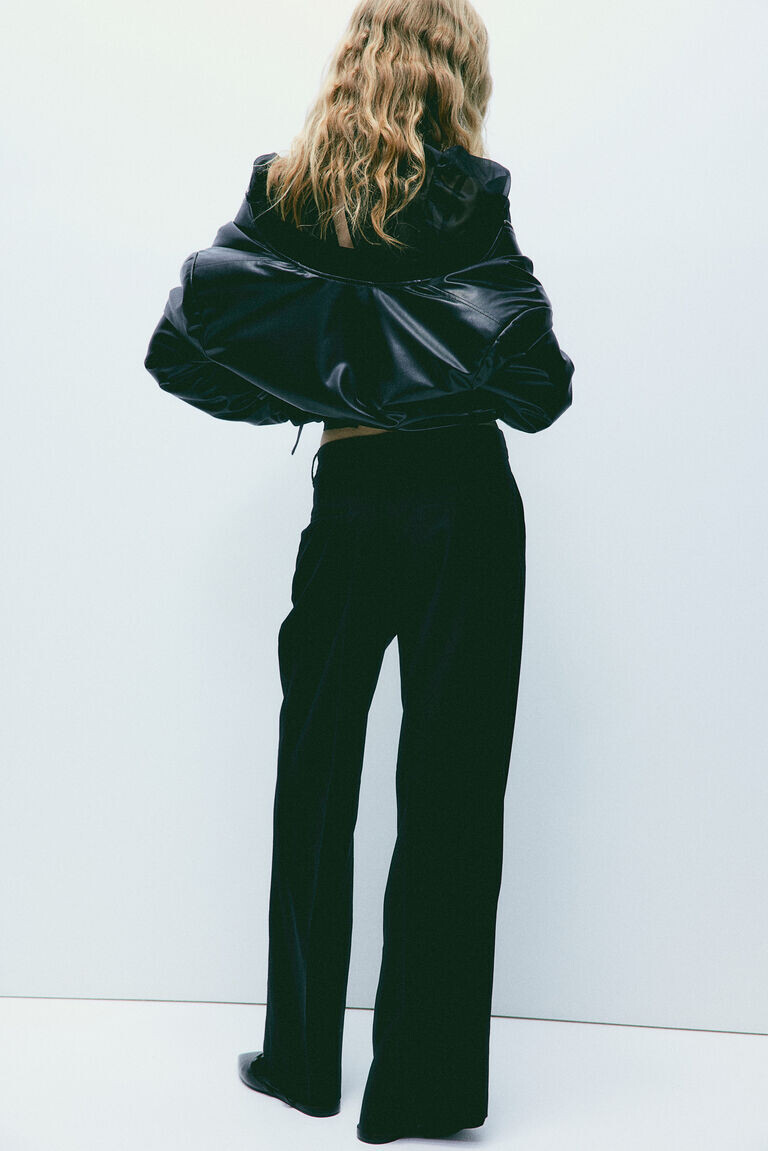 Брюки свободного кроя из твила со складками сверху, ширинкой на молнии и удлиненным поясом со потайной застежкой на крючки. Диагональные боковые карманы, ложные прорезные карманы сзади и широкие прямые брючины со складками. Описательная длина: Обычная талия. Посадка: Свободная посадка.