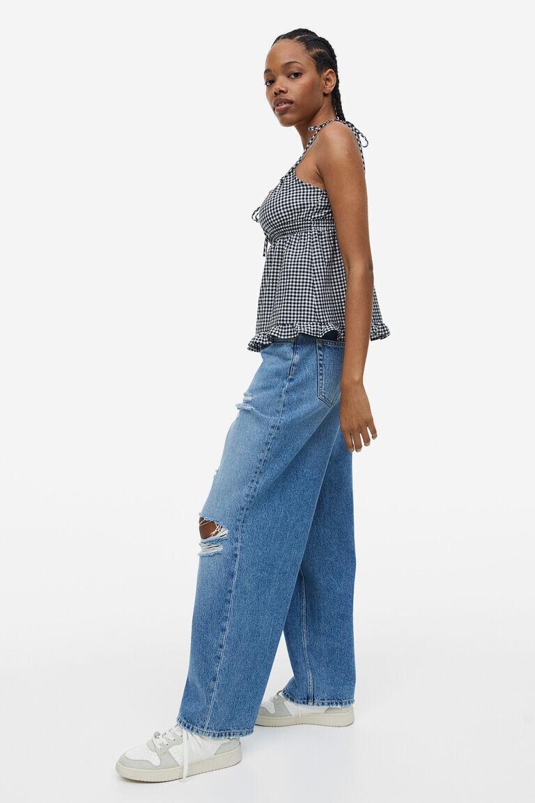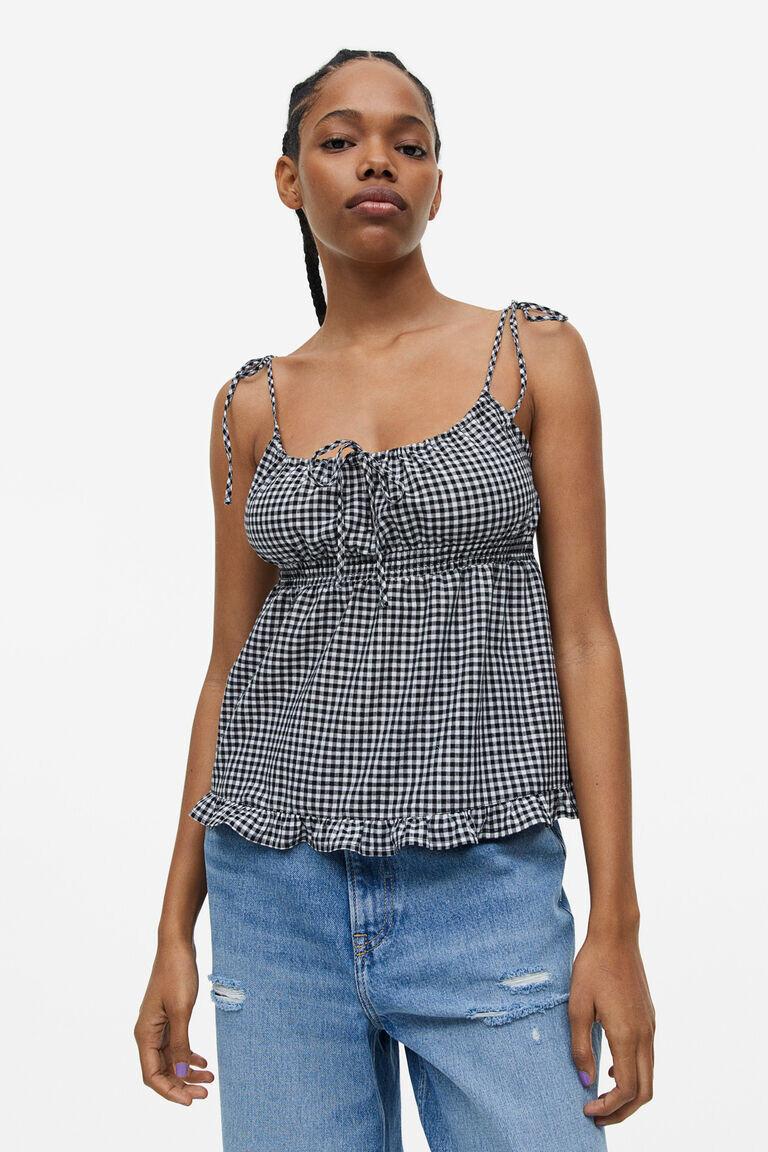 Топ без рукавов из тканого материала с завязывающимися бретельками-спагетти и вырезом-капля спереди на узких завязках. Присборенная часть под грудью создает эффект присборенности над бюстом и расклешенный низ. Небольшая оборка по краю. Описательная длина: обычная длина. Стиль: квадратный вырез. Посадка: стандартная посадка.