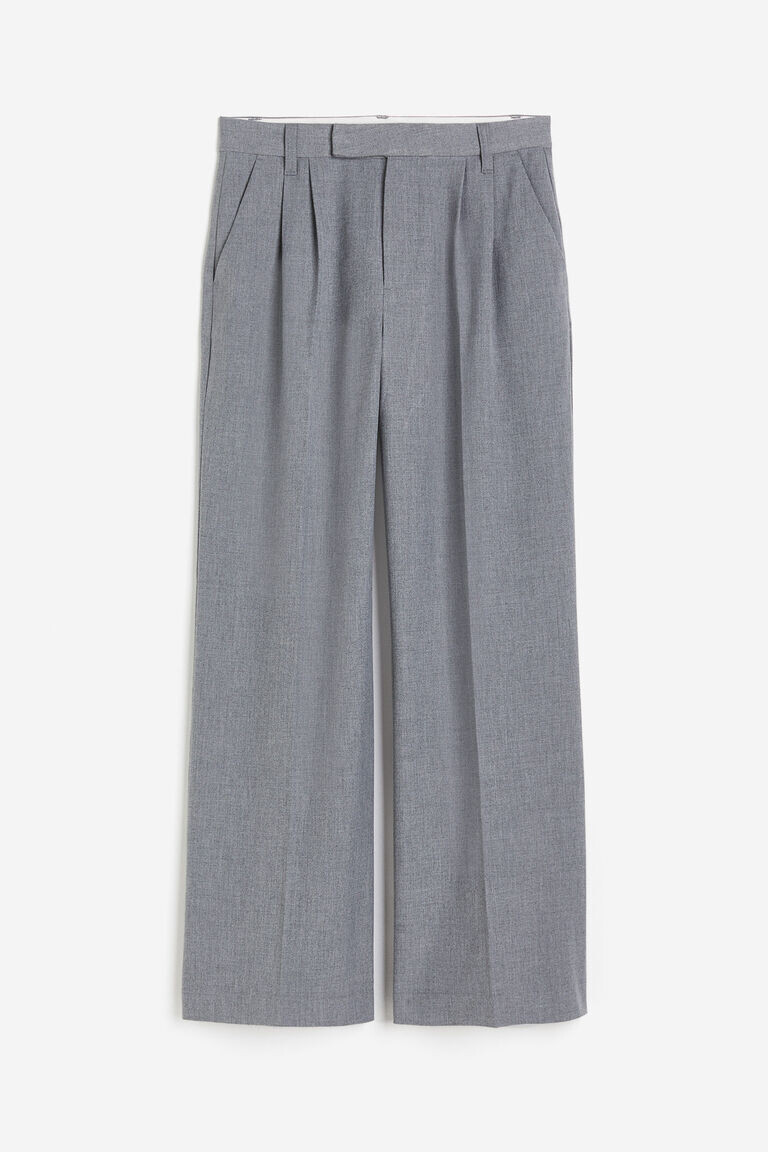 Брюки свободного кроя из твила со складками сверху, ширинкой на молнии и удлиненным поясом со потайной застежкой на крючки. Диагональные боковые карманы, ложные прорезные карманы сзади и широкие прямые брючины со складками. Описательная длина: Обычная талия. Посадка: Свободная посадка.