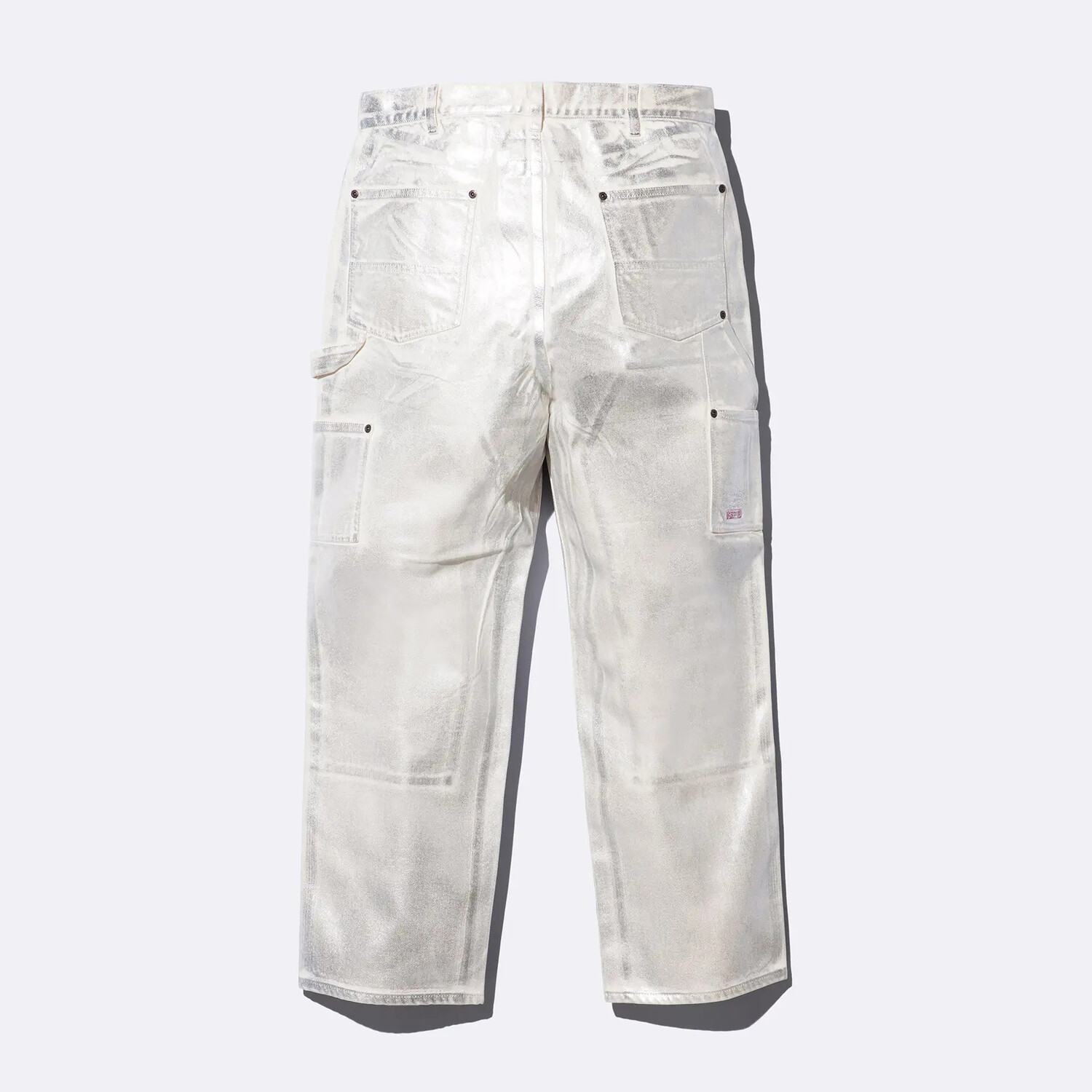 Полностью хлопковый холст с ручным ворсом. Утилитарный стиль с ширинкой на молнии, двойными коленями, одним карманом для монет, заклепками из оксида меди, карманами для мелочей и петлей для молотка на левой штанине. Вышитый логотип и цифровая подпись MM6 на хозяйственном кармане. Белая строчка MM6 сзади.