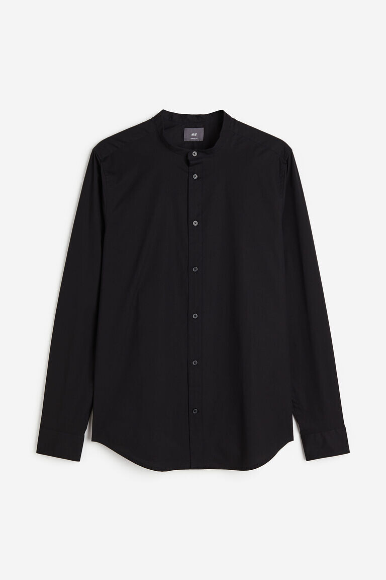 Рубашка из хлопкового поплина стрейч с воротником-дедушкой, классическим передом, кокеткой и вытачками сзади. Длинные рукава с регулируемой застежкой на манжетах и планкой на пуговице, а также закругленным низом. Muscle Fit – посадка, подчеркивающая телосложение с узкими плечами и зауженными рукавами для создания привлекательного силуэта. Описательная длина: длинный рукав. Стиль: дедушкиный воротник. Ответ: Мышцы подходят.