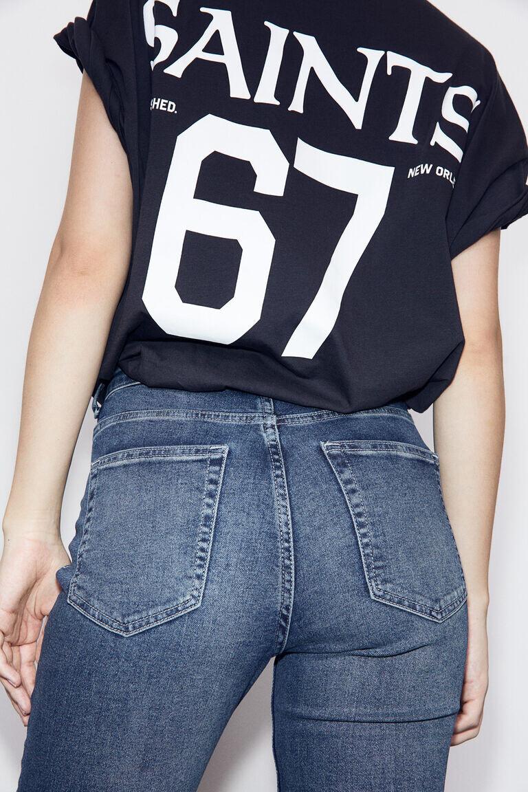 Джинсы из слегка эластичного денима с высокой талией, ширинкой на молнии и пуговицах, ложными передними карманами, настоящим карманом для монет, настоящими задними карманами и узкими брючинами. Описательная длина: длина до щиколотки. Посадка: узкая посадка.
