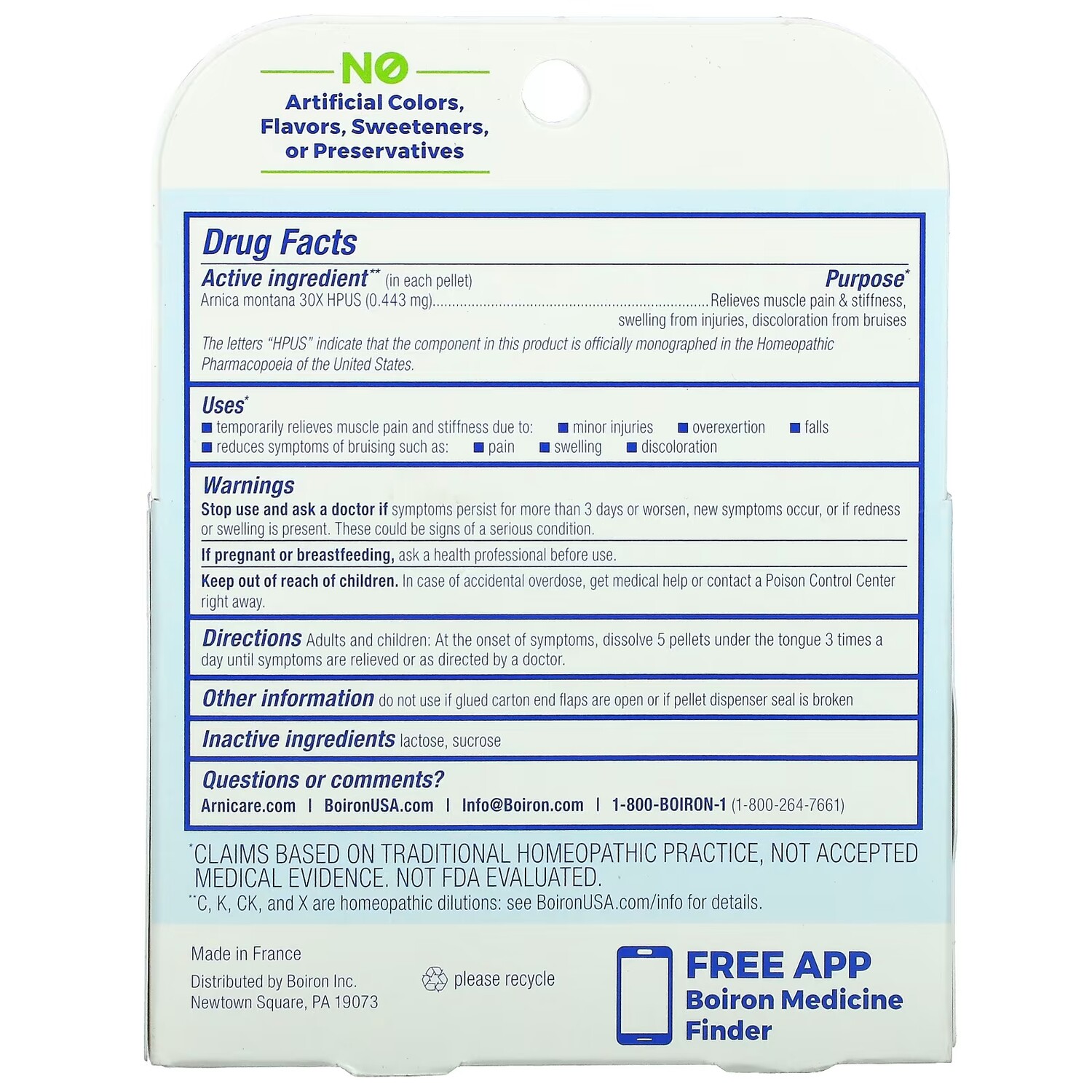 Активные ингредиенты: арника монтана (Arnica montana) 30X HPUS. Травма, мышечные боли & скованность, отек от травм, изменение цвета от ушибов. Буква HPUS указывает на то, что этот ингредиент официально включен в гомеопатическую фармакопею США. Неактивные ингредиенты: лактоза, сахароза. Прекратите использование и проконсультируйтесь с врачом, если симптомы не исчезают или ухудшаются по истечении 3 дней использования. Перед применением во время беременности или кормления грудью следует проконсультироваться с врачом. Хранить в недоступном для детей месте. Не следует использовать данный продукт, если поврежден дозатор гранул.