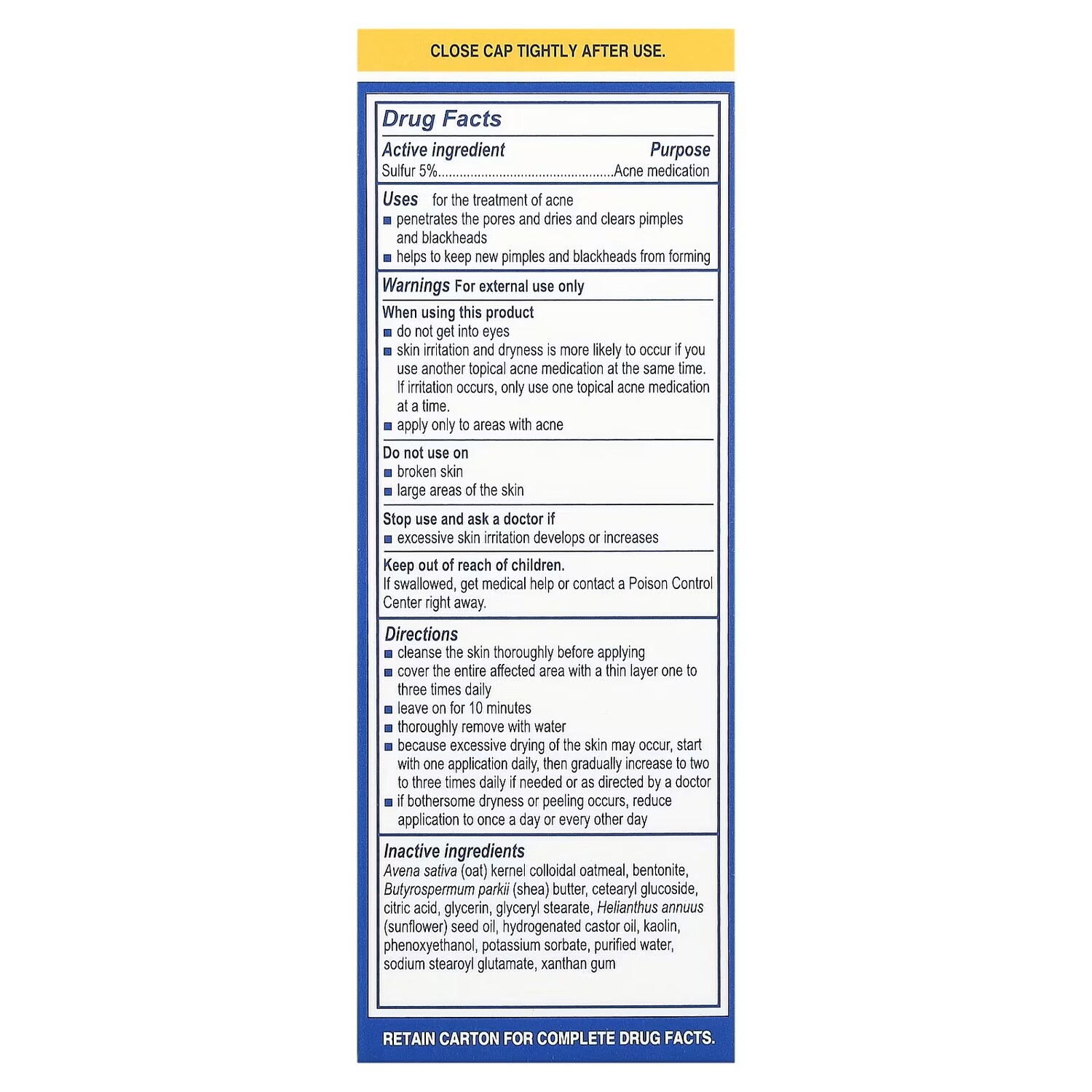 Активный ингредиент: сера - 5%. Борьба с акне. Вспомогательные ингредиенты: коллоидная овсянка (Avena sativa), бентонит, масло ши (Butyrospermum parkii), цетеариловый глюкозид, лимонная кислота, глицерин, глицерил стеарат, масло семян подсолнечника (Helianthus annuus), гидрогенизированное касторовое масло, каолин, феноксиэтанол, сорбат калия, очищенная вода стеароил глутамат натрия, ксантановая камедь. Только для наружного применения. При использовании этого продукта придерживайтесь следующих правил: не допускайте попадания в глаза. Возможно более частое возникновение раздражения и сухости кожи, если одновременно с этим продуктом используется другой препарат против акне. При возникновении раздражения одновременно используйте только один препарат для местного применения против акне. Наносите только на участки с акне. Не использовать в следующих случаях: на поврежденные участки кожи на большие участки кожи. Прекратите использование и обратитесь к врачу в перечисленных ниже случаях. появилось или усиливается чрезмерное раздражение кожи. Хранить в недоступном для детей месте. При проглатывании средства необходимо немедленно обратиться к врачу или в токсикологический центр. Сохраните картонную упаковку для получения полных данных о препаратах. Состав и назначение Активный ингридиент Назначение Сера, USP 5% Лечение акне Неактивные ингредиенты: Овсяная колбасная овсяная мука Avena sativa (овсяная), масло масел бутироспермума (shea), цетеарилглюкозид, лимонная кислота, глицерин, глицерилстеарат, масло из семян подсолнечника, гидрированное касторовое масло, каолин, феноксиэтанол, сорбат калия.