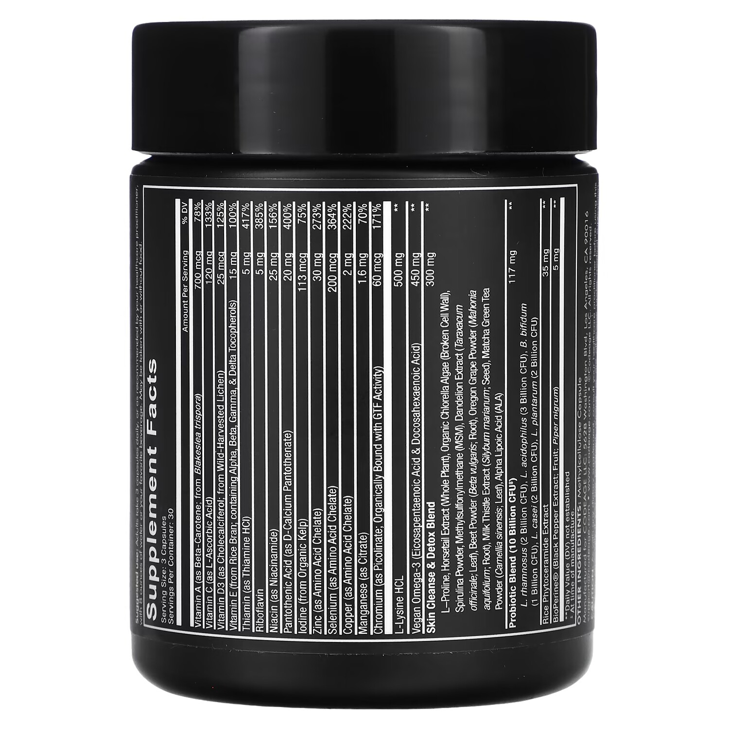 Витамин A (в виде бета-каротина из гриба Blakeslea trispora)700 мкг78%Витамин C (в виде L-аскорбиновой кислоты)120 мг133%Витамин D3 (в виде холекальциферола из дикорастущих лишайников)25 мкг125%Витамин E (из рисовых отрубей; содержит альфа-, бета-, гамма- и дельта-токоферолы)15 мг100%Тиамин (в виде тиамина гидрохлорида)5 мг417%Рибофлавин5 мг385%Ниацин (в виде никотинамида)25 мг156%Пантотеновая кислота (в виде D-пантотената кальция)20 мг400%Йод (из органических бурых водорослей)113 мкг75%Цинк (в виде аминокислотного хелата)30 мг273%Селен (в виде аминокислотного хелата)200 мкг364%Медь (в виде аминокислотного хелата)2 мг222%Марганец (в виде цитрата)1,6 мг70%Хром (в виде пиколината; органически связанного с активностью ФТГ)60 мкг171%L-лизина гидрохлорид500 мгВеганская омега-3 (эйкозапентаеновая кислота и докозагексаеновая кислота)450 мгСмесь для очищения и детоксикации кожиL-пролин, экстракт целого растения хвоща, органические водоросли хлорелла (с разрушенной клеточной стенкой), порошок из спирулины, метилсульфонилметан (МСМ), экстракт листьев одуванчика (Taraxacum officinale), порошок из корнеплода свеклы (Beta vulgaris), порошок из корня магонии падуболистной (Mahonia aquifolium), экстракт семян расторопши (Silybum marianum), порошок из листьев зеленого чая матча (Camellia sinensis), альфа-липоевая кислота (АЛК)300 мгСмесь пробиотиков (10 млрд КОЕ‡)Лактобактерии рамнозус (L.