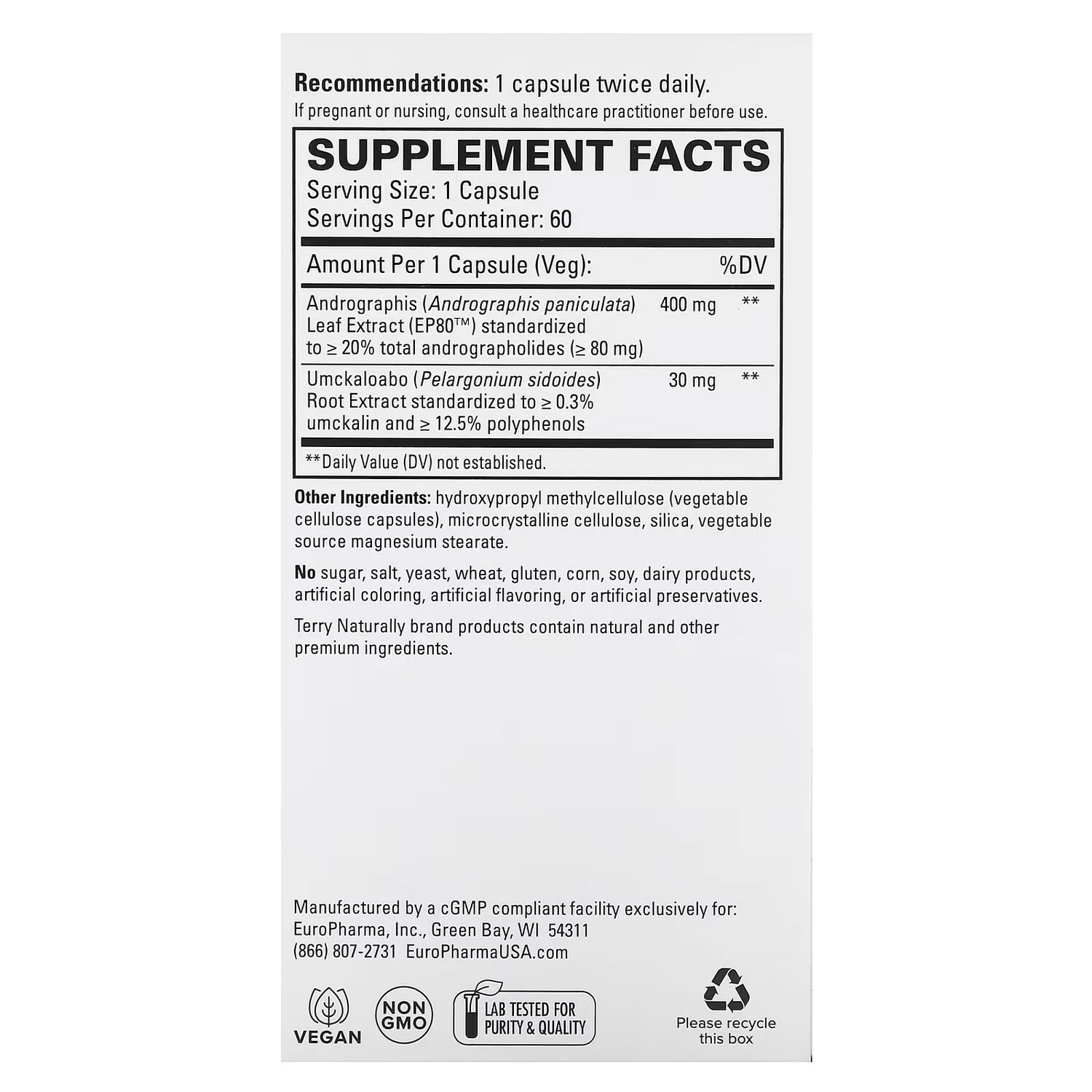 Добавка Terry Naturally Andrographis EP80 с умкалоабо, 60 капсул