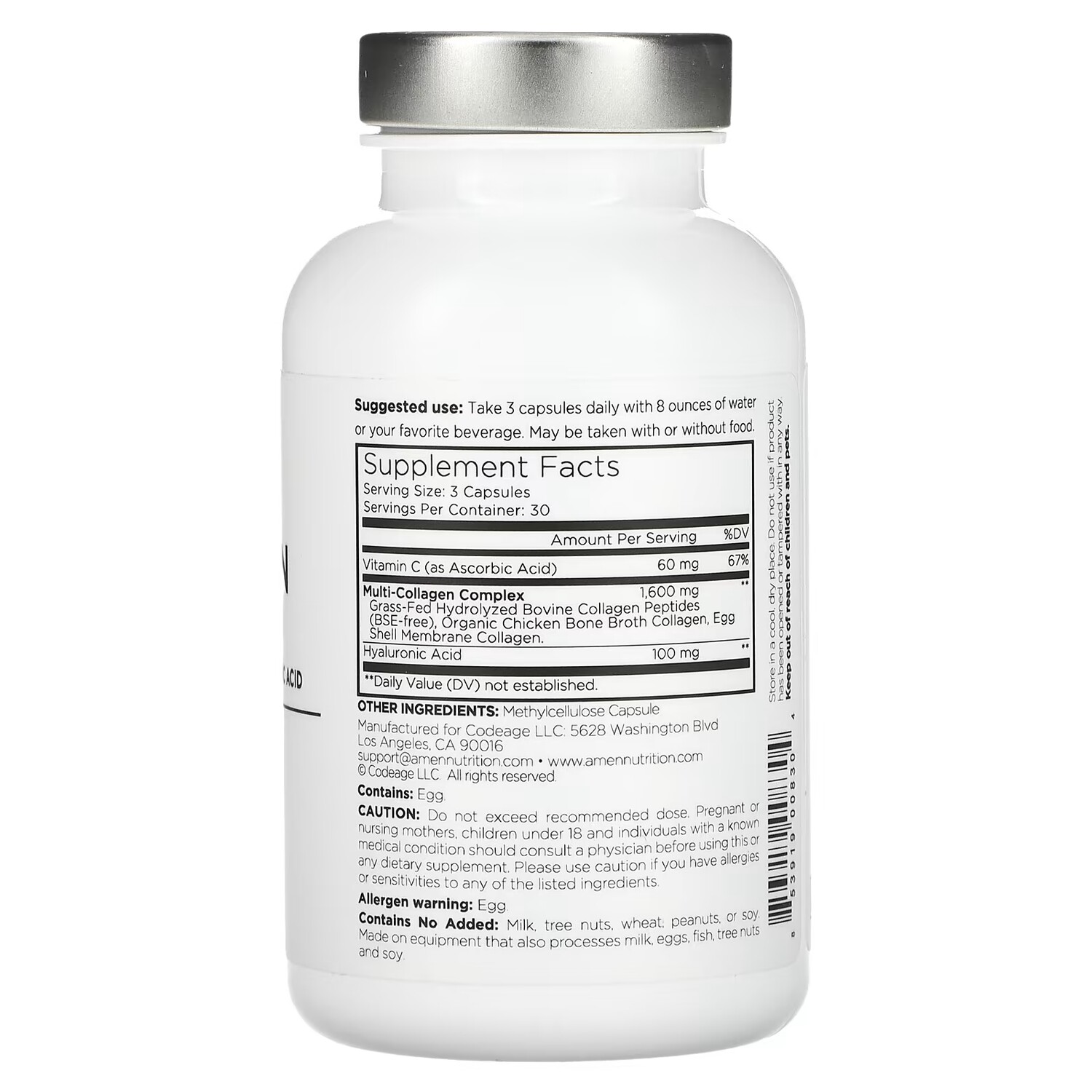 Добавка Amen в виде мультиколлагеновых капсул содержит 5 типов коллагена, витамин С и гиалуроновую кислоту для создания комплексной и удобной формулы коллагена.