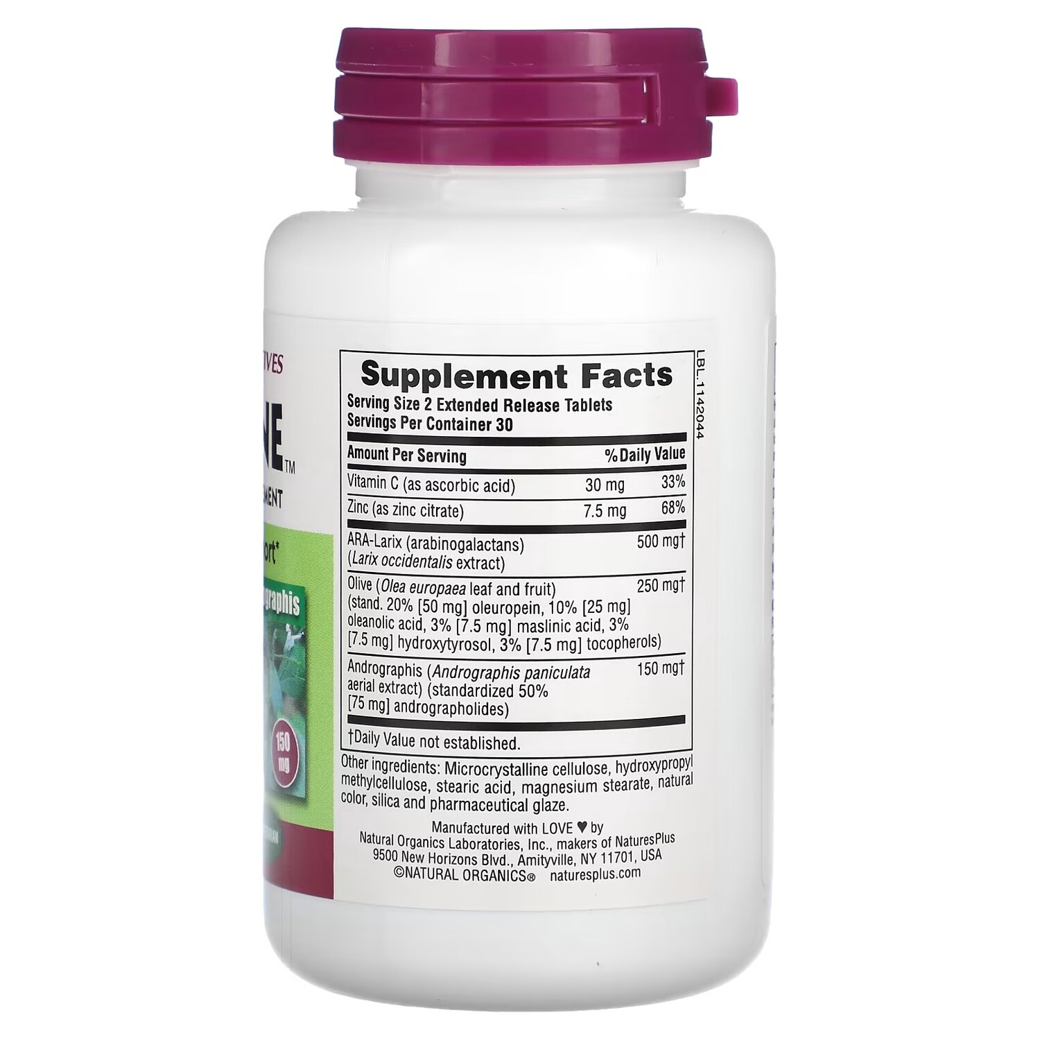 Витамин С (в виде аскорбиновой кислоты)30 мг33%Цинк (в виде цитрата цинка)7,5 мг68%ARA-Larix (арабиногалактаны)(Экстракт ларихи западной)500 мгОлива (листья и плоды Olea europaea) (подставка 20% [50 мг] олеуропеина, 10% [25 мг]олеаноловая кислота, 3% [7,5 мг] маслиновой кислоты, 3%[7,5 мг] гидрокситирозола, 3% [7,5 мг] токоферолов)250 мгАндрографис метельчатый (Andrographis paniculataвоздушный экстракт) (стандартизированный 50%[75 мг] андрографолидов)150 мг. Суточная норма не определена.