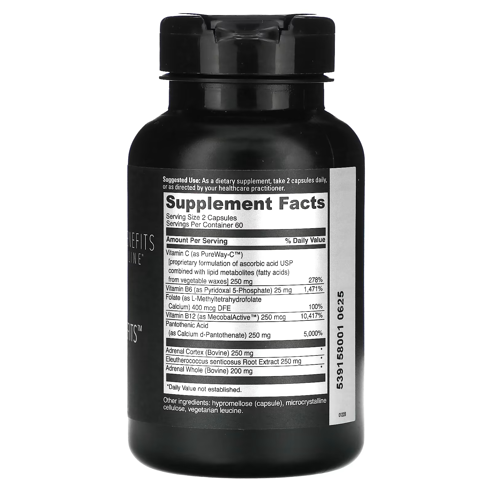 Пищевая ценностьРазмер порции: 2 капсулыПорций в упаковке: 60 Количество в 1 порции% от суточной нормыВитамин C (в виде PureWay-C [запатентованный состав аскорбиновой кислоты USP в сочетании с липидными метаболитами (жирными кислотами) из растительных восков] 250 мг250 мг278%Витамин B6 (в виде пиридоксаль 5-фосфата)25 мг1471%Фолат (в виде L-метилтетрагидрофолата кальция)400 мкг DFE100%Витамин B12 (в виде MecobalActive )250 мкг10 471%Пантотеновая кислота(в виде d-пантотената кальция)250 мг5000%Кора надпочечников (бычьи)250 мгЭкстракт корня элеутерококка колючего (Eleutherococcus senticosus)250 мгНадпочечники (бычий)200 мг Суточная норма не определена.