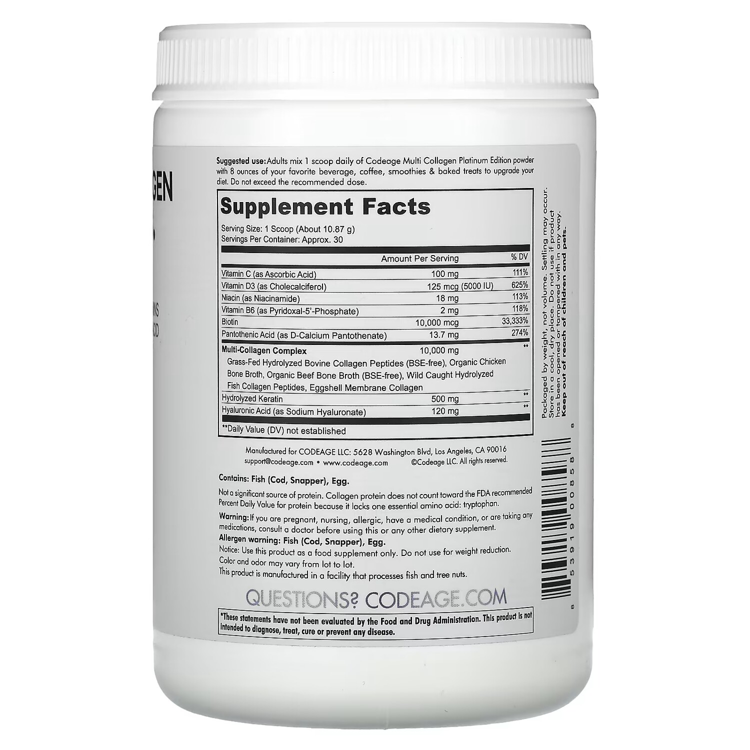 Мультиколлагеновый комплекс Platinum от CodeAge - это высококачественная порошкообразная добавка, содержащая 5 типов пептидов коллагена, 10 000 мкг биотина, гидролизованный кератин, гиалуроновую кислоту, ниацин, а также различные витамины и аминокислоты.