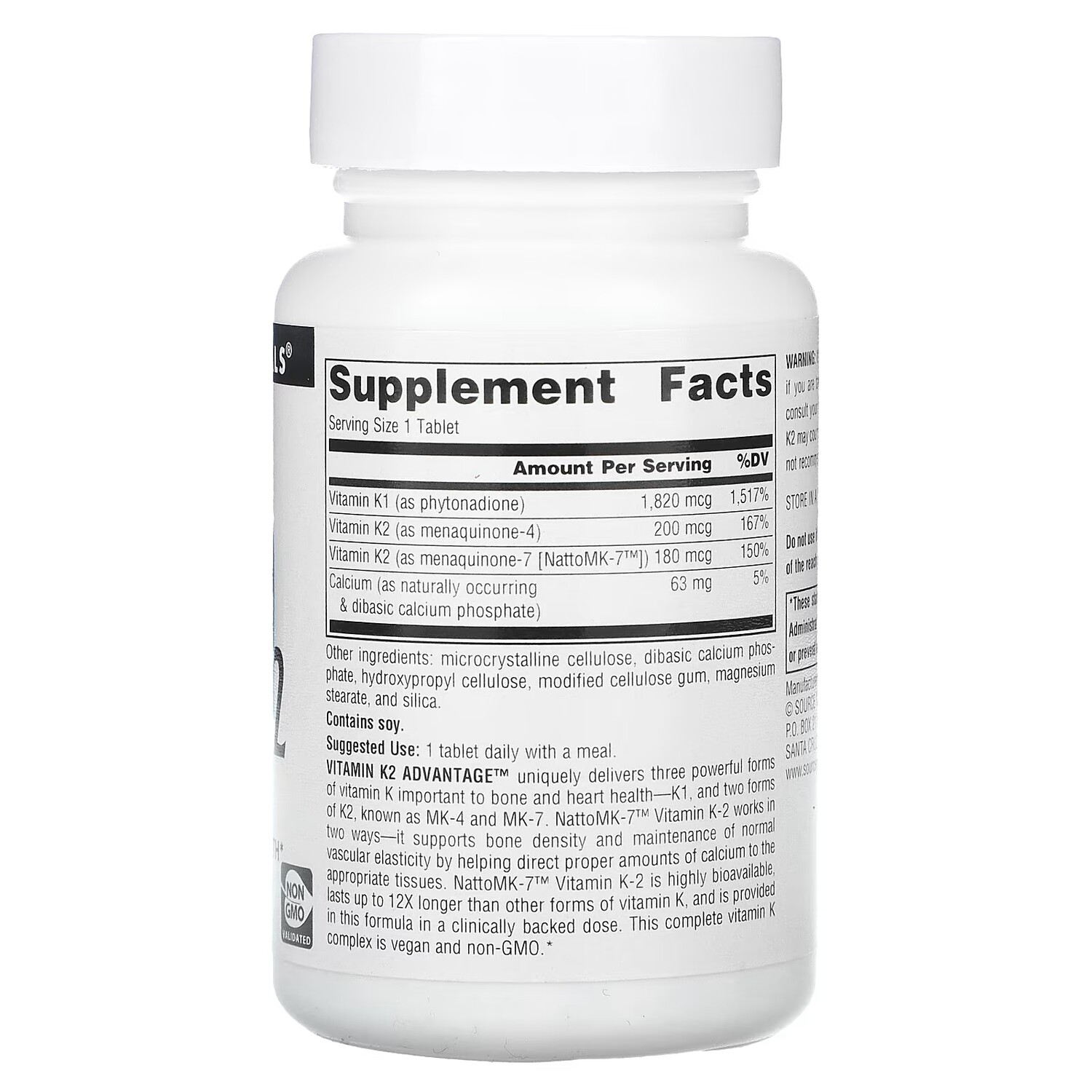 Пищевая ценностьРазмер порции: 1 таблеткаПорций в упаковке: Количество в 1 порции% от суточной нормыВитамин K1 (в виде фитонадиона)1820 мкг1,517%Витамин К2 (в виде менахинона-4)200 мкг167%Витамин K2 (в виде менахинона-7 [NattoMK-7 ])180 мкг150%Кальций (в виде природного и двухосновного фосфата кальция)63 мг5%
