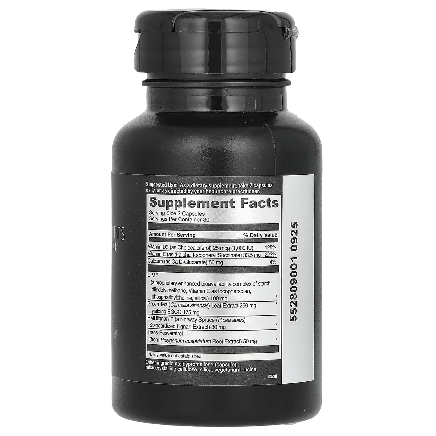 Пищевая ценностьРазмер порции: 2 капсулыПорций в упаковке: 30 Количество в 1 порции% от суточной нормыВитамин D3 (в виде холекальциферола) 25 мкг (1000 МЕ)125%Витамин E (в виде d-альфа токоферил сукцината) 33,5 мг223%Кальций (в виде D-глюкарата кальция) 50 мг4%DIM(запатентованный комплекс крахмала с улучшенной биодоступностью, дииндолилметан, витамин Е в виде токоферсолана, фосфатидилхолин, диоксид кремния) 100 мгэкстракт листьев зеленого чая (Camellia sinensis) 250 мгс выходом EGCG 175 мгHMRlignan (стандартизированный экстракт лигнана из ели обыкновенной (Picea abies)) 30 мгТранс-ресвератрол (из экстракта корня рейнутрии японской [Polygonum cuspidatum]).