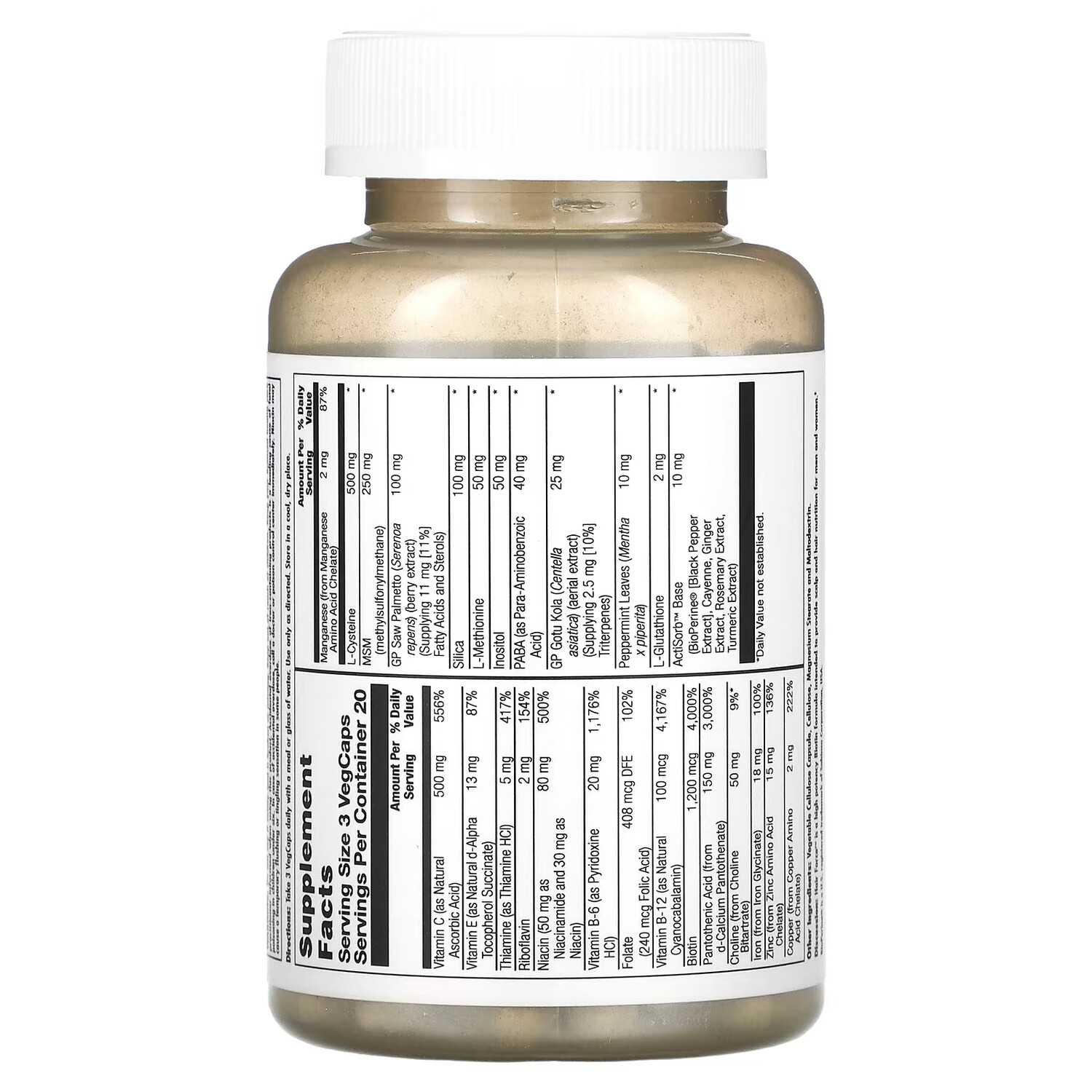 Дополнительные факты Размер порции: 3 вегетарианских шапки Порций в контейнере: 20 Количество на порцию % Дневная стоимость Витамин С (как природная аскорбиновая кислота) 500 мг 833% Витамин Е (как натуральный d-альфа-токоферил сукцинат) 13 МЕ 43% Тиамин (в виде тиамина HCl) 5 мг 333% Рибофлавин 2 мг 118% Ниацин (50 мг в качестве ниацинамида и 30 мг в качестве ниацина) 80 мг 400% Витамин В-6 (как пиридоксин HCl) 20 мг 1000% Фолиевая кислота 400 мкг 100% Витамин B-12 (как природный цианокобаламин) 100 мкг 1667% биотин 1,200 мкг 400% Пантотеновая кислота (как пантотенат d-кальция) 150 мг 1500% Железо (как глицитин железа) 18 мг 100% Цинк (в виде ацетата цинка) 15 мг 100% Медь (как медь-аминокислотная хелатная кислота) 2 мг 100% Марганец (в качестве марганцевой аминокислоты хелата) 2 мг 100% L-цистеин 500 мг МСМ (метилсульфонилметан) 250 мг GP Saw Palmetto (Serenoa repens) (экстракт ягод) (Поставка 11 мг [11%] жирных кислот и стеролов) 100 мг кремнезем 100 мг L-Метионин 50 мг Холин (как холиновый битартрат) 50 мг инозит 50 мг ПАБА (как пара-аминобензойная кислота) 40 мг GP Gotu Kola (Centella asiatica) (воздушный экстракт) (поставка 2,5 мг [10%] тритерпенов) 25 мг Листья мяты перечной (Mentha x piperita) 10 мг L-глутатион 2 мг База ActiSorb (Bioperine [Экстракт черных перчиков], Кайенна, Экстракт имбиря, Экстракт розмарина, Экстракт куркумы) 10 мгСуточная доза не определена.