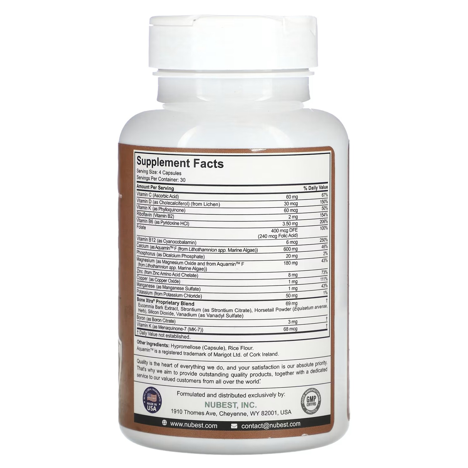 Пищевая ценностьРазмер порции: 4 капсулыПорций в упаковке: 30 Количество в 1 порции% от суточной нормыВитамин С (аскорбиновая кислота)60 мг67%Витамин D (в виде холекальциферола) (из лишайника) 30 мкг 150% Витамин K (виде филлохинона) 60 мкг 50% Рибофлавин (витамин B2) 2 мг 154% Витамин B6 (в виде пиридоксина гидрохлорида) 3,50 мг 206% Фолат 400 мкг пищевого фолатного эквивалента (240 мкг фолиевой кислоты) 100% Витамин B12 (в виде цианокобаламина) 6 мкг 250% Кальций (в виде Aquamin F (из литотамнии [вид Lithothamnion]) морские водоросли)600 мг 46% Фосфор (в виде дикальция фосфата) 20 мг 2% Магний (в виде оксида магния и из Aquamin F (из литотамнии [вид Lithothamnion]) морские водоросли) 180 мг 43% Цинк (из аминокислотного хелата цинка) 8 мг73% Медь (в виде оксида меди)1 мг111%Марганец (в виде сульфата марганца)1 мг43%Калий (из хлорида калия)50 мг1%Запатентованная смесь Bone Xtraэкстракт коры эукоммии, стронций (в виде цитрата стронция), порошок хвоща полевого (Equisetum arvense), диоксид кремния, ванадий (в виде ванадилсульфата)69 мгБор (в виде цитрата бора)3 мгВитамин K (в виде менахинона-7 (МК-7))68 мкг Суточная норма не определена.