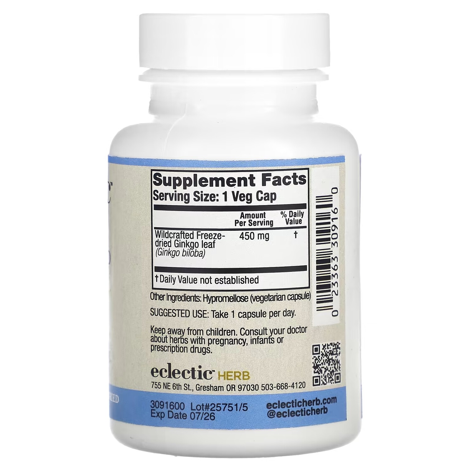 Гинкго Eclectic Institute 450 мг без экстрактов, 90 растительных капсул