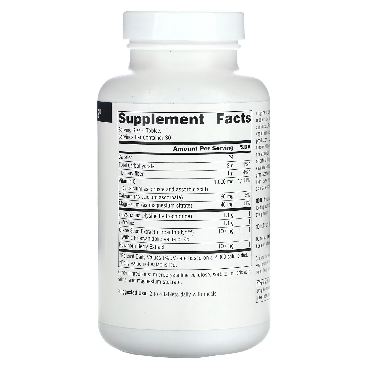 Калории 24. Всего углеводов 2 г, 1%. Пищевая клетчатка 1 г, 4%. Витамин C (в виде аскорбата кальция и аскорбиновой кислоты) 1000 мг, 1111%. Кальций (из аскорбата кальция) 66 мг, 5%. Магний (в виде цитрата магния) 46 мг, 11%. L-лизин (в виде гидрохлорида L-лизина) 1,1 г. L-пролин 1,1 г. Экстракт виноградных косточек (Proanthodyn) с процианидольным значением 95100 мг. Экстракт ягод боярышника 100 мг. Процент от суточной нормы при условии потребления 2000 калорий в день.