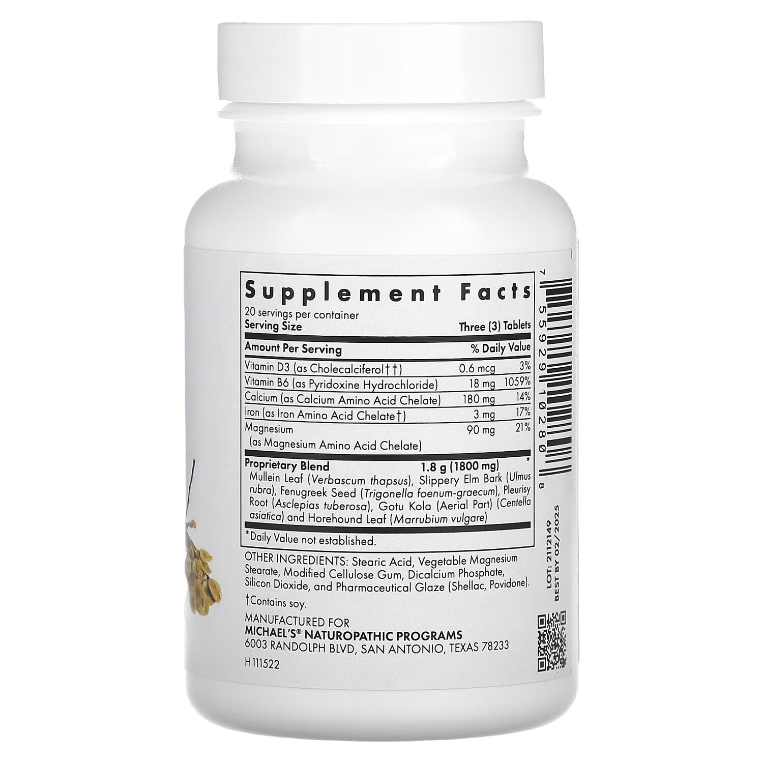 Витамин D3 (в виде холекальциферола) 0,6 мкг, 3%. Витамин В6 (в виде пиридоксина гидрохлорида) 18 мг, 1059%. Кальций (в виде аминокислотного хелата кальция) 180 мг, 14%. Железо (в виде аминокислотного хелата железа) 3 мг, 17%. Магний (в виде аминокислотного хелата магния) 90 мг, 21%. Листья коровяка (Verbascum thapsus), кора вяза красного (Ulmus rubra), семена пажитника (Trigonella foenum-graecum), корень плеврита (Asclepias Tuberosa), надземная часть готу колы (Centella asiatica) и листья шандры (Marrubium vulgare) 1,8 г (1800 мг). Содержит сою. Из ланолина.
