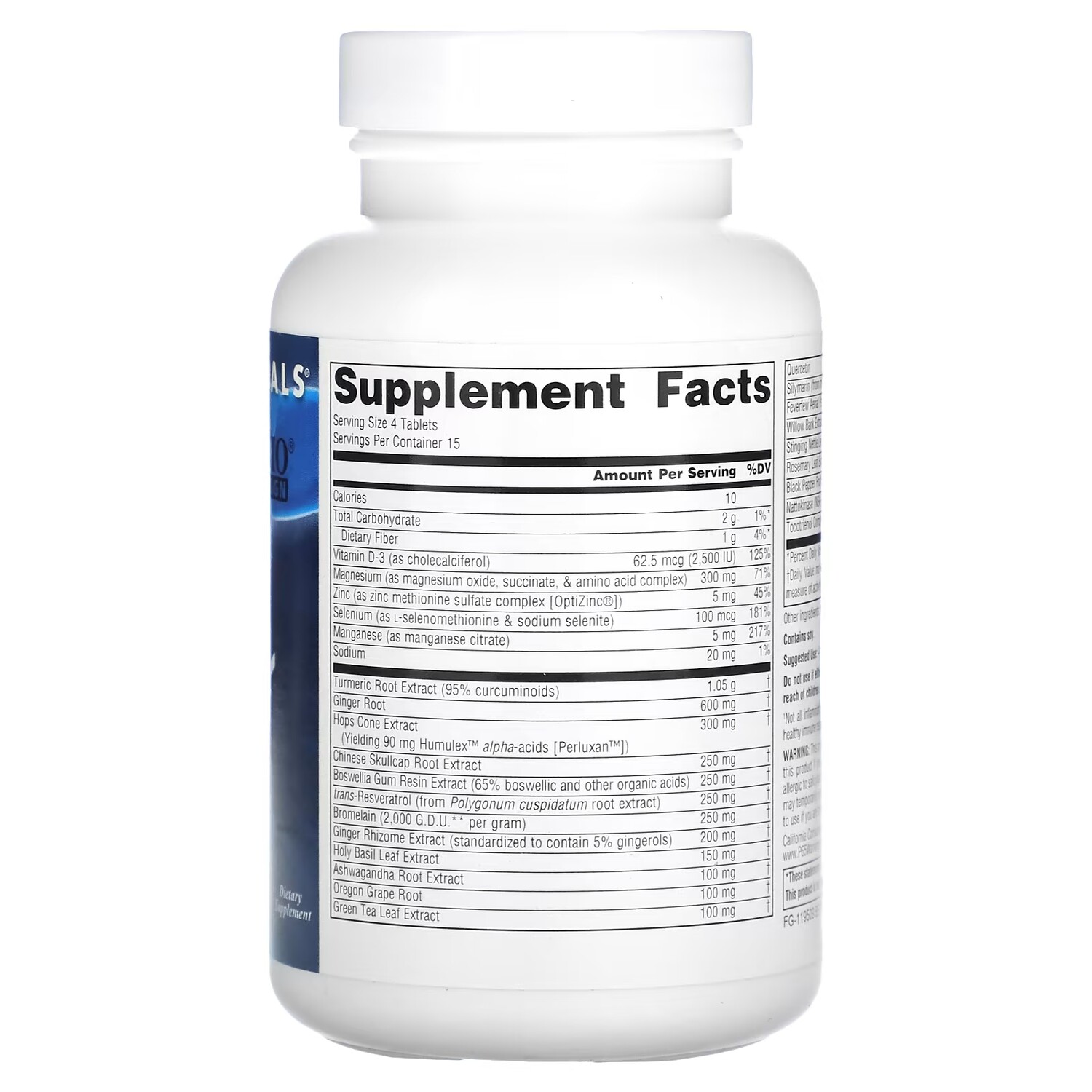 Калории: 10. Всего углеводов: 2 г, 1%. Пищевая клетчатка: 1 г, 4%. Витамин D3 (в виде холекальциферола): 62,5 мкг (2500 МЕ), 125%. Магний (в виде оксида магния, сукцината и аминокислотного комплекса): 300 мг, 83%. Цинк (в виде комплекса сульфата цинка метионина (OptiZinc)): 5 мг, 45%. Селен (в виде L-селенометионина и селенита натрия): 100 мкг, 181%. Марганец (в виде цитрата марганца): 5 мг, 217%. Натрий: 20 мг, 1%. Экстракт корня куркумы (95% куркуминоидов): 1,05 г. Корень имбиря (Zingiber officinale): 600 мг. Экстракт шишек хмеля (Получено 90 мг альфа-кислот Humulex (Perluxan)): 300 мг. Экстракт корня шлемника китайского: 250 мг. Экстракт смолы босвеллии (65% босвеллиевой и других органических кислот): 250 мг. Транс-ресвератролы (из экстракта корня многоугольника кунжутного): 250 мг. Бромелаин (2000 GDU на грамм): 250 мг. Экстракт корневища имбиря (стандартизированный до содержания 5% гингеролов): 200 мг. Экстракт листьев базилика священного: 150 мг. Экстракт корня ашваганды: 100 мг. Корень магонии падуболистной: 100 мг. Экстракт листьев зеленого чая: 100 мг. Кверцетин: 90 мг. Силимарин (из экстракта семян расторопши): 80 мг. Экстракт надземных частей пиретрума: 80 мг. Экстракт коры ивы: 80 мг. Листья крапивы двудомной: 60 мг. Экстракт листьев розмарина: 50 мг. Экстракт плодов черного перца (BioPerine): 15 мг. Наттокиназа (NSK-SD): 12 мг. Токотриенольный комплекс (EVNolMax): 10 мг.