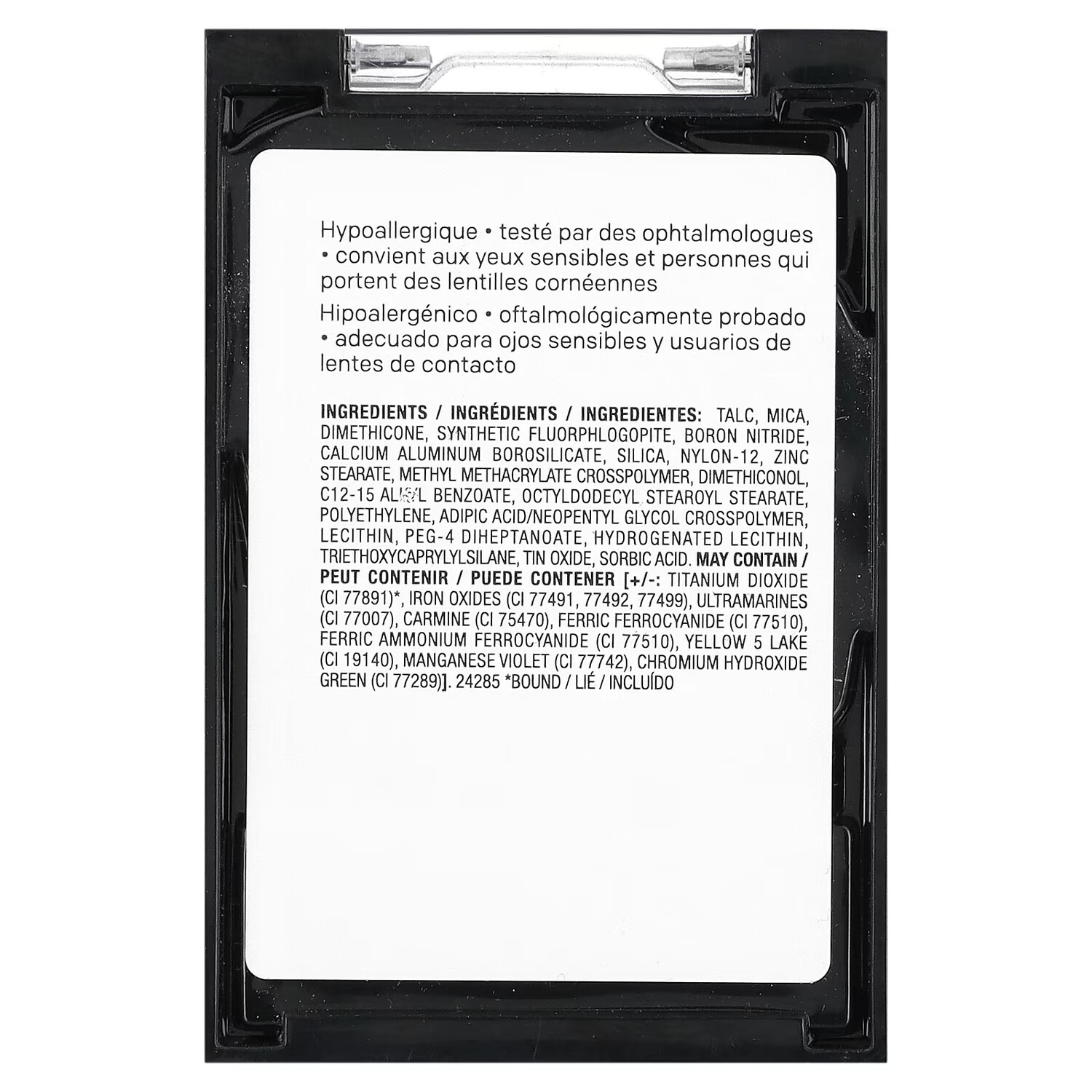 Может содержать: диоксид титана (CI 77891), оксиды железа (CI 77491, 77492, 77499), ультрамарины (CI 77007), кармин (CI 75470), берлинскую лазурь (CI 77510), ферроцианид железа и аммония (CI 77510), краситель желтый 5 (CI 19140), краситель темно-фиолетовый (CI 77742), гидроксид хрома зеленый (CI 77289).