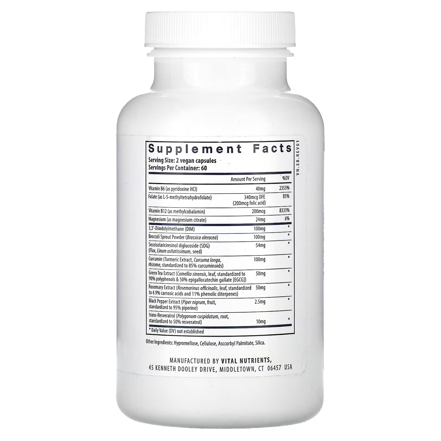 Витамин B6 (в виде пиридоксина гидрохлорида) - 40 мг, 2353%. Фолат (в виде 5-метилтетрагидрофолата) - 340 мкг DFE (200 мкг фолиевой кислоты), 85%. Витамин B12 (в виде метилкобаламина) - 200 мкг, 8333%. Магний (в виде цитрата магния) - 24 мг, 6%. 3,3'-дииндолилметан (DIM) - 100 мг. Порошок из ростков брокколи (Brassica oleracea) - 100 мг. Секоизоларицирезинол диглюкозид (СДГ) (семена льна, Linum usitatissimum) - 54 мг. Куркумин (экстракт корневища куркумы, куркумы (Curcuma longa), стандартизированный до 85% куркуминоидов) - 100 мг. Экстракт зеленого чая (Camellia sinensis, лист, стандартизированный до 90% полифенолов и 50% эпигаллокатехин-галлата (EGCG)) - 50 мг. Экстракт розмарина (Rosemarinus officinalis, лист, стандартизированный до содержания 4,9% карнозиновых кислот и 11% фенольных дитерпенов) - 50 мг. Экстракт плодов черного перца (Piper nigrum, стандартизированный до 95% пиперина) - 2,5 мг. Транс-ресвератрол (Polygonum cuspidatum, корень, стандартизированный до 50% ресвератрола) - 10 мг.