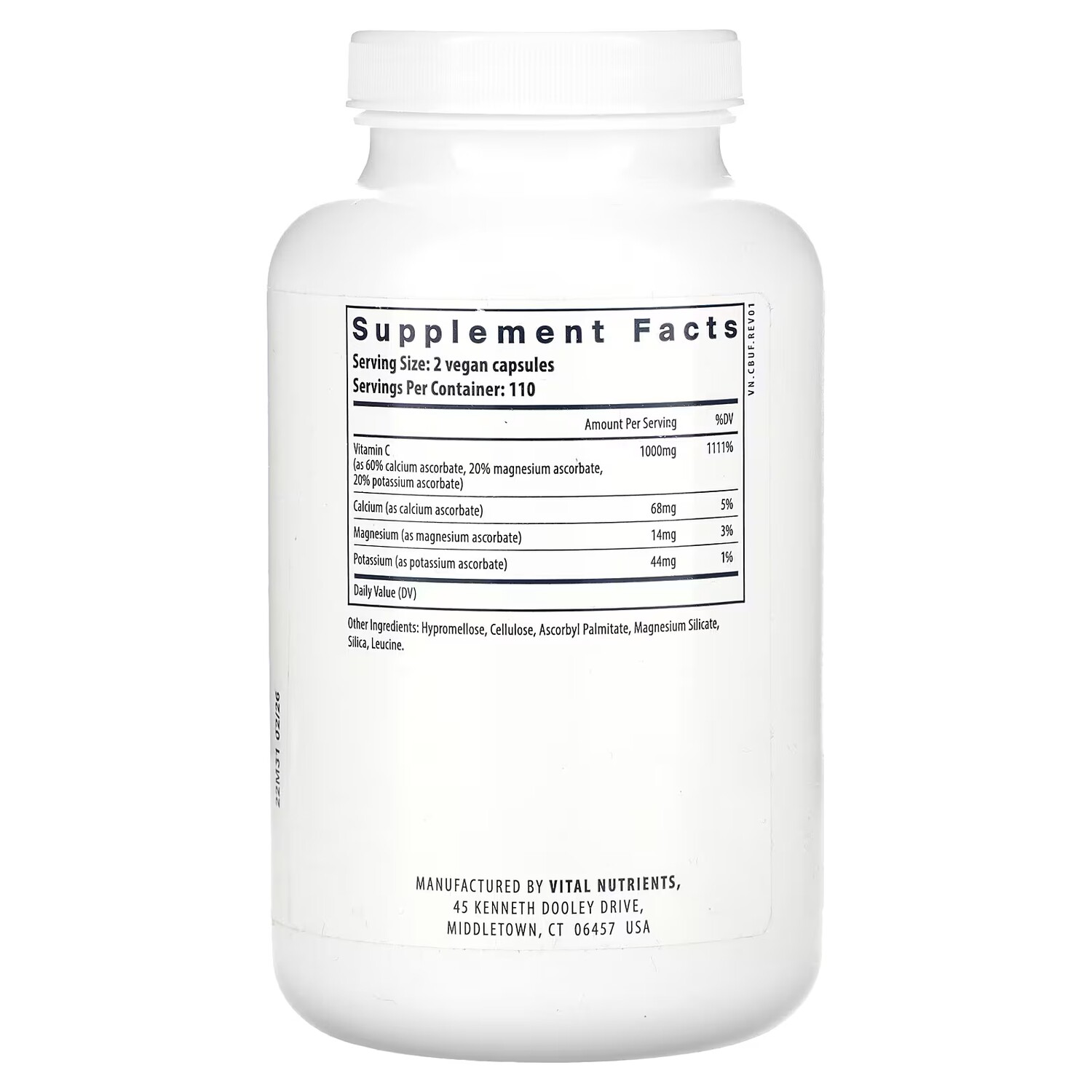 Витамин C (в виде 60% аскорбата кальция, 20% аскорбата магния, 20% аскорбата калия) 1000 мг, 1111%. Кальций (в виде аскорбата кальция) 68 мг, 5%. Магний (в виде аскорбата магния) 14 мг, 3%. Калий (в виде аскорбата калия) 44 мг, 1%.