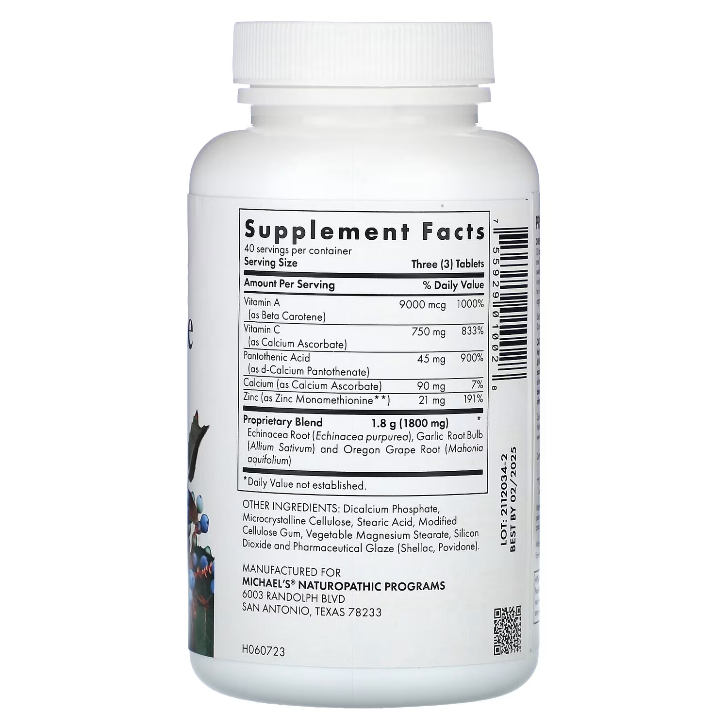 Витамин A (в виде бета-каротина) 9000 мкг, 1000%. Витамин C (в виде аскорбата кальция) 750 мг, 833%. Пантотеновая кислота (в виде д-кальция пантотената) 45 мг, 900%. Цинк (в виде цинка монометионина) 21 мг, 191%. Корень эхинацеи (Echinacea purpurea), луковица чеснока (Allium Sativum) и корень орегонского винограда (Mahonia aquifolium) 1,8 г (1800 мг).