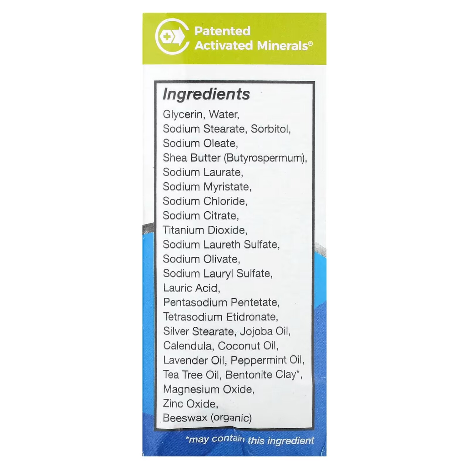 Глицерин, вода, стеарат натрия, сорбитол, олеат натрия, масло ши (Butyrospermum), лаурат натрия, миристат натрия, хлорид натрия, цитрат натрия, диоксид титана, лауретсульфат натрия, оливат натрия, лаурилсульфата натрия, лауриновая кислота, пентанатрия пентетат, тетранатрия этидронат, стеарат серебра, масло жожоба, календула, кокосовое масло, лавандовое масло, масло перечной мяты, масло чайного дерева, бентонитовая глина, оксид магния, оксид цинка, пчелиный воск (органический).