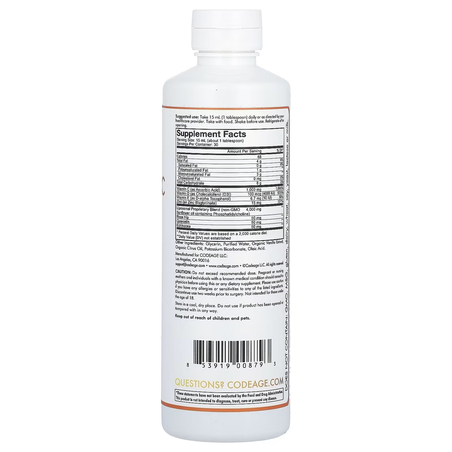 Калории 68. Всего жиров 4 г, 6%. Насыщенные жиры 0 г. Полиненасыщенные жиры 1 г. Мононенасыщенные жиры 3 г. Холестериновые жиры 0 мг. Всего углеводов 8 г, 3%. Витамин С (в виде аскорбиновой кислоты) 1000 мг, 1665%. Витамин D (в виде холекальциферола (D3) 100 мкг (4000 МЕ), 625%. Витамин E (в виде d-альфа-токоферола) 6,7 мг (10 МЕ), 30%. Цинк (бисглицинат цинка) 15 мг, 127%. Запатентованная липосомальная смесь (подсолнечное масло без ГМО, содержащее фосфатидилхолин) 4000 мг. Шиповник 50 мг. Кверцетин 50 мг. Эхинацея 50 мг. Процент от суточной нормы при условии потребления 2000 калорий в день.