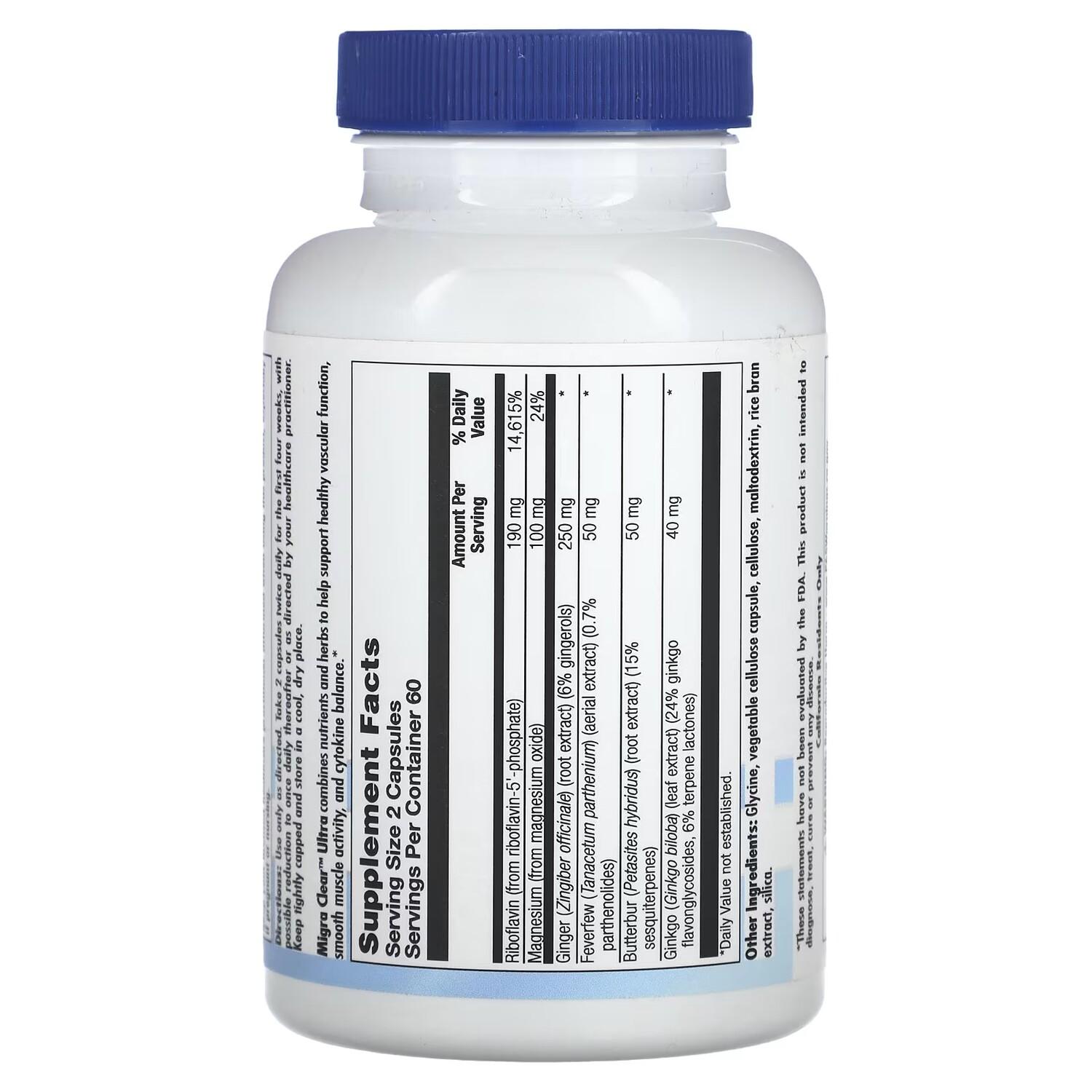 Этот продукт веганский, без ГМО и глютена. Migra Clear Ultra разработан для поддержания нормальной работы сосудов, активности гладкой мускулатуры.
