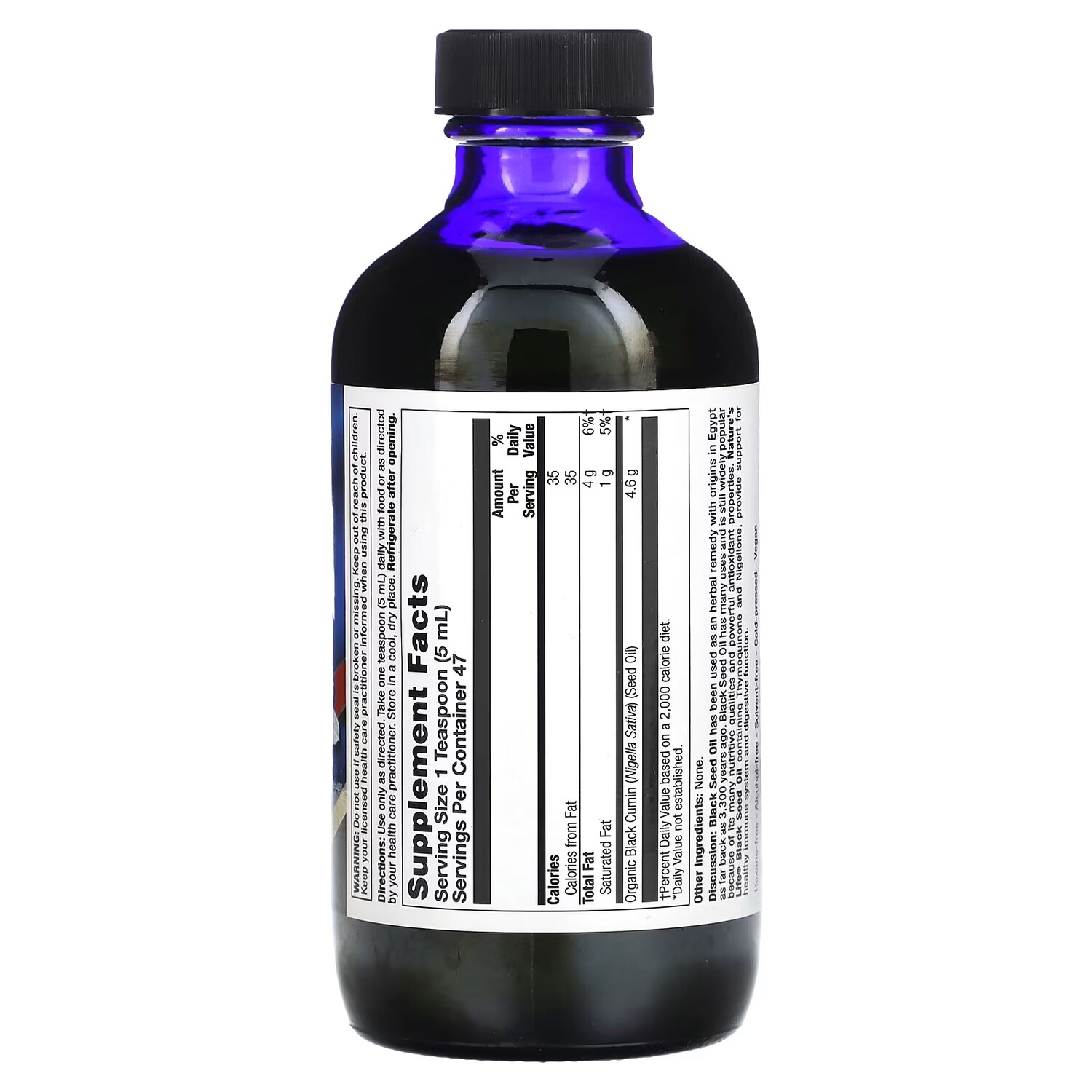 Калории 35. Всего жиров 4 г, 6%. Насыщенные жиры 1 г, 5%. Масло из семян органического черного тмина (Nigella sativa) 4,6 г. Процент от суточной нормы при условии потребления 2000 калорий в день.