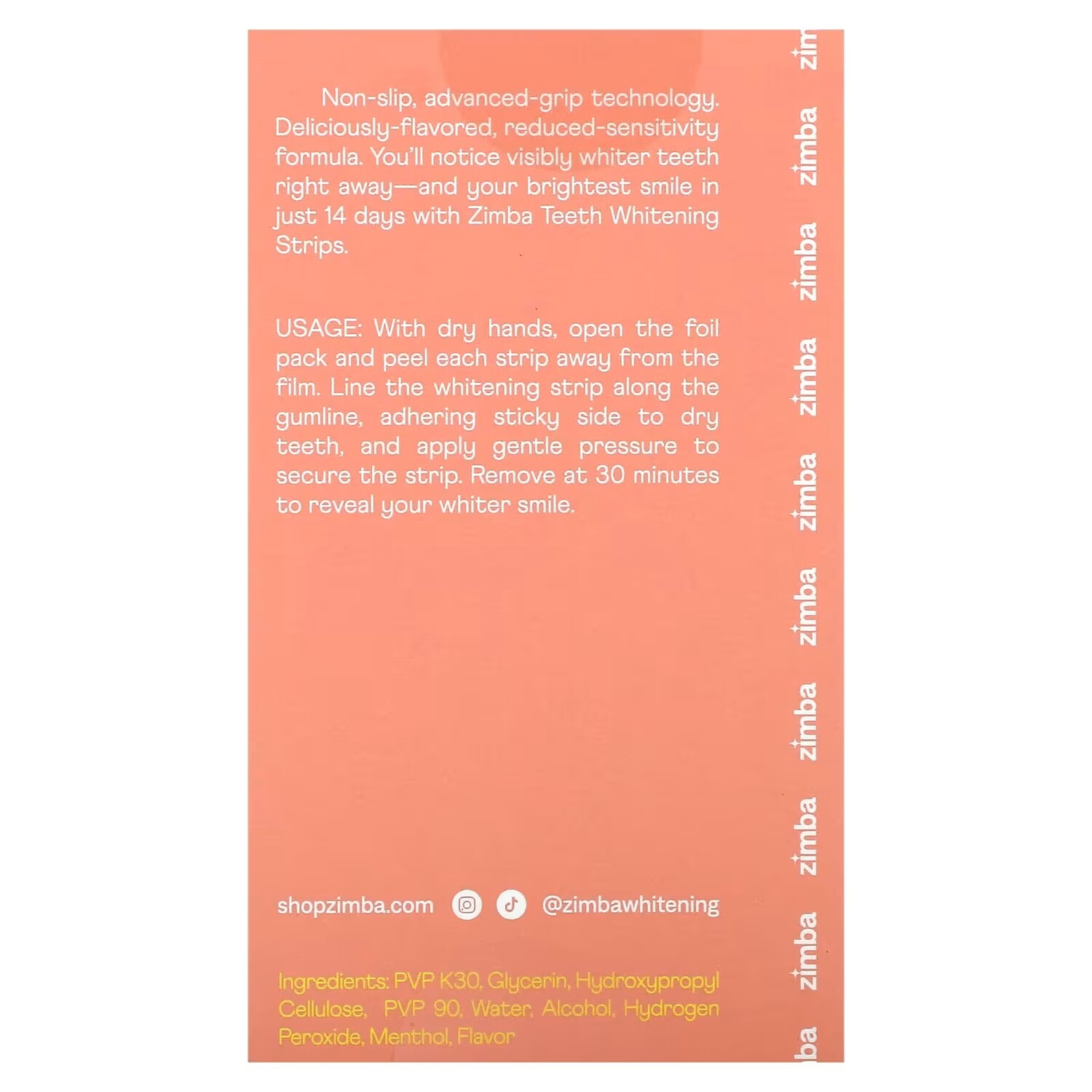Профессиональные результаты за 30 минут. Безопасно для эмали. Чистый, веганский и этичный продукт. для верхней и нижней части кожи (2 полоски). Всего 28 полосок. Улучшенная технология предотвращения скольжения. Формула с восхитительным вкусом, снижающая чувствительность. Вы сразу заметите заметно более белые зубы и самую сияющую улыбку всего за 14 дней благодаря полоскам для отбеливания зубов Zimba.